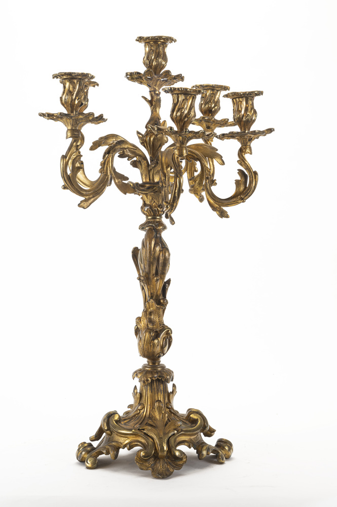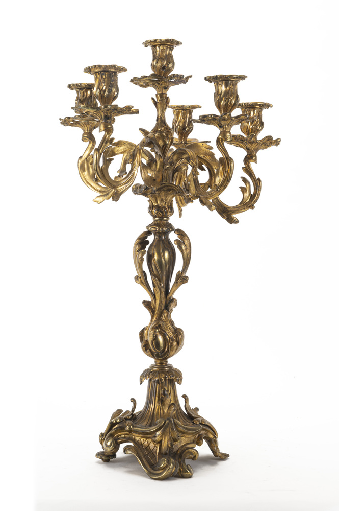 Trittico composto da orologio e due candelabri in bronzo dorato Rococò