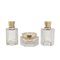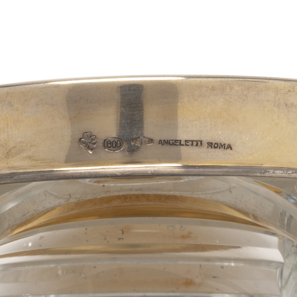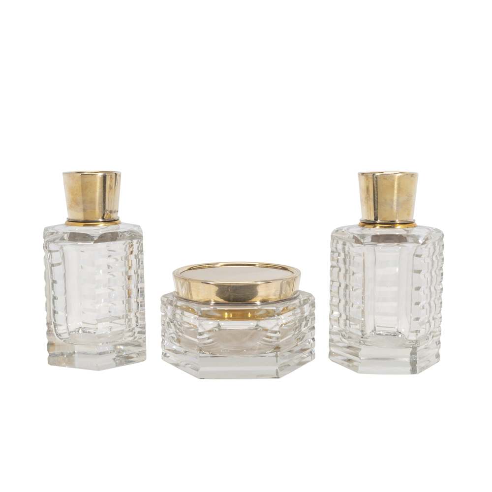 Tre flaconi in cristallo molato a forma esagonale con coperchio in argento dorato
