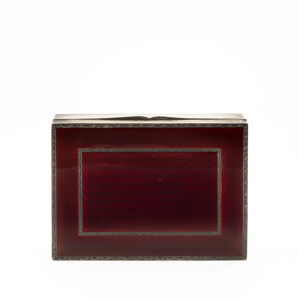 Hinged lid decorated with translucent dark red enamel and with silver inlaid thread