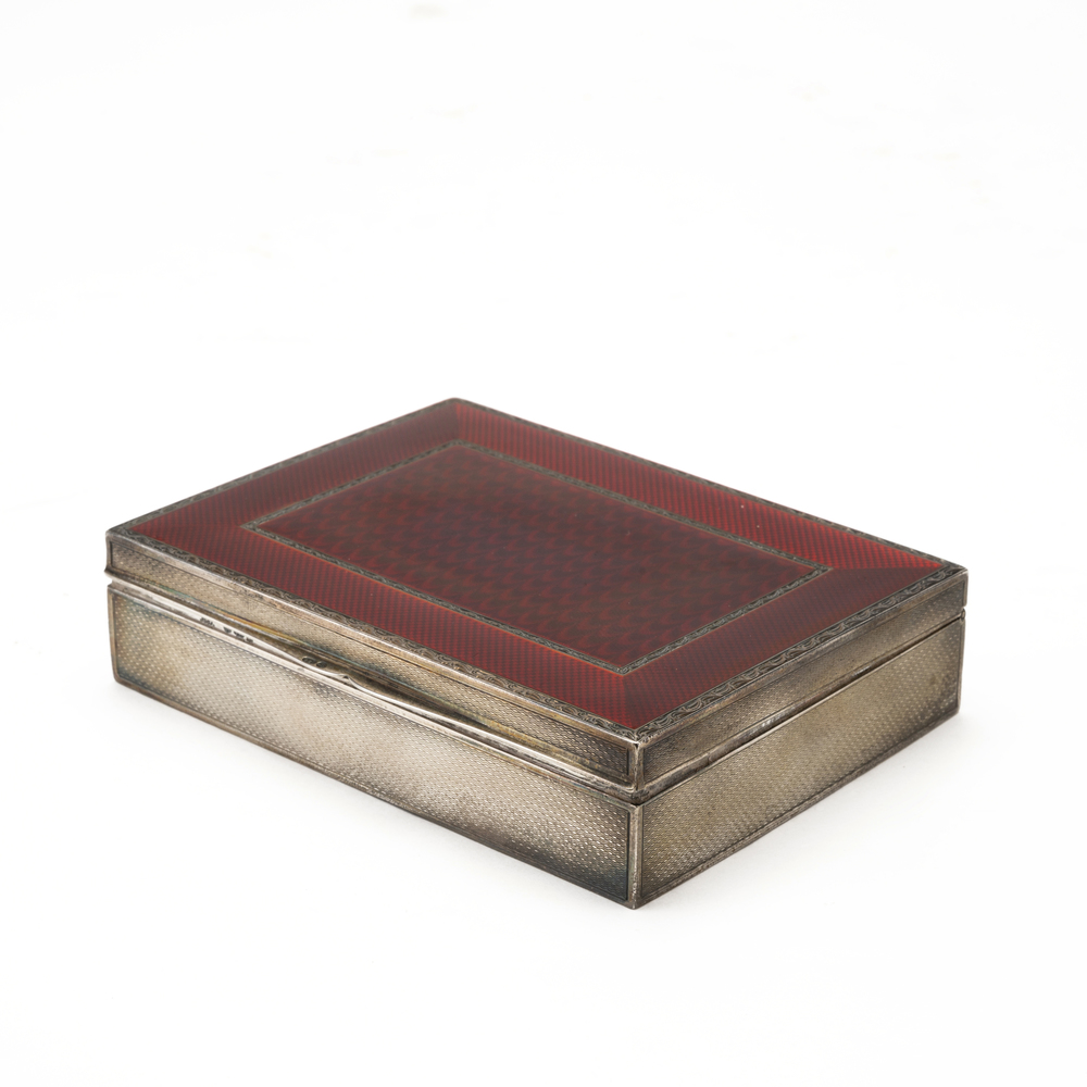 Coperchio incernierato decorato con smalto traslucido rosso scuro e con filetto intarsiato in argento
