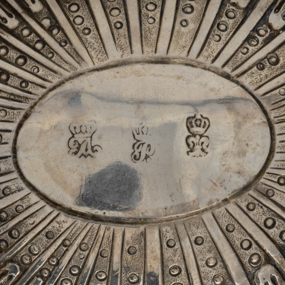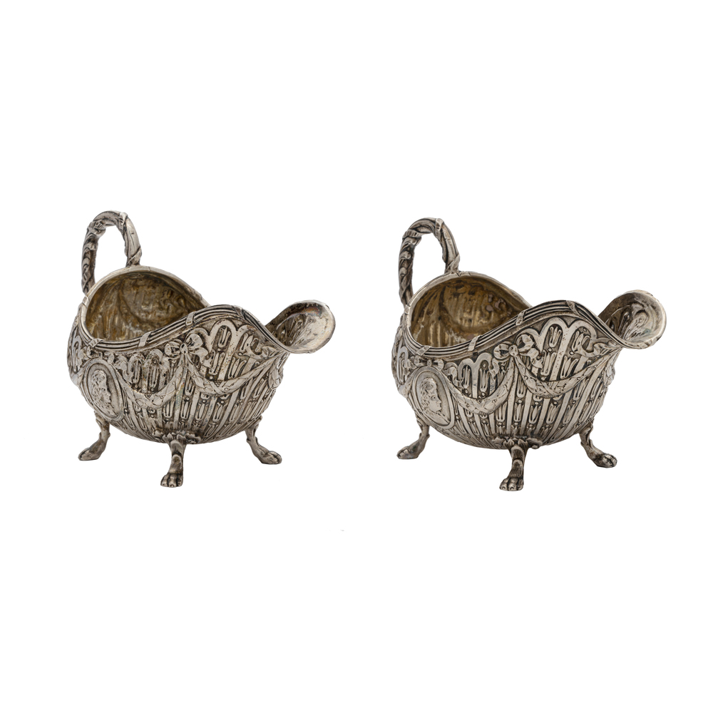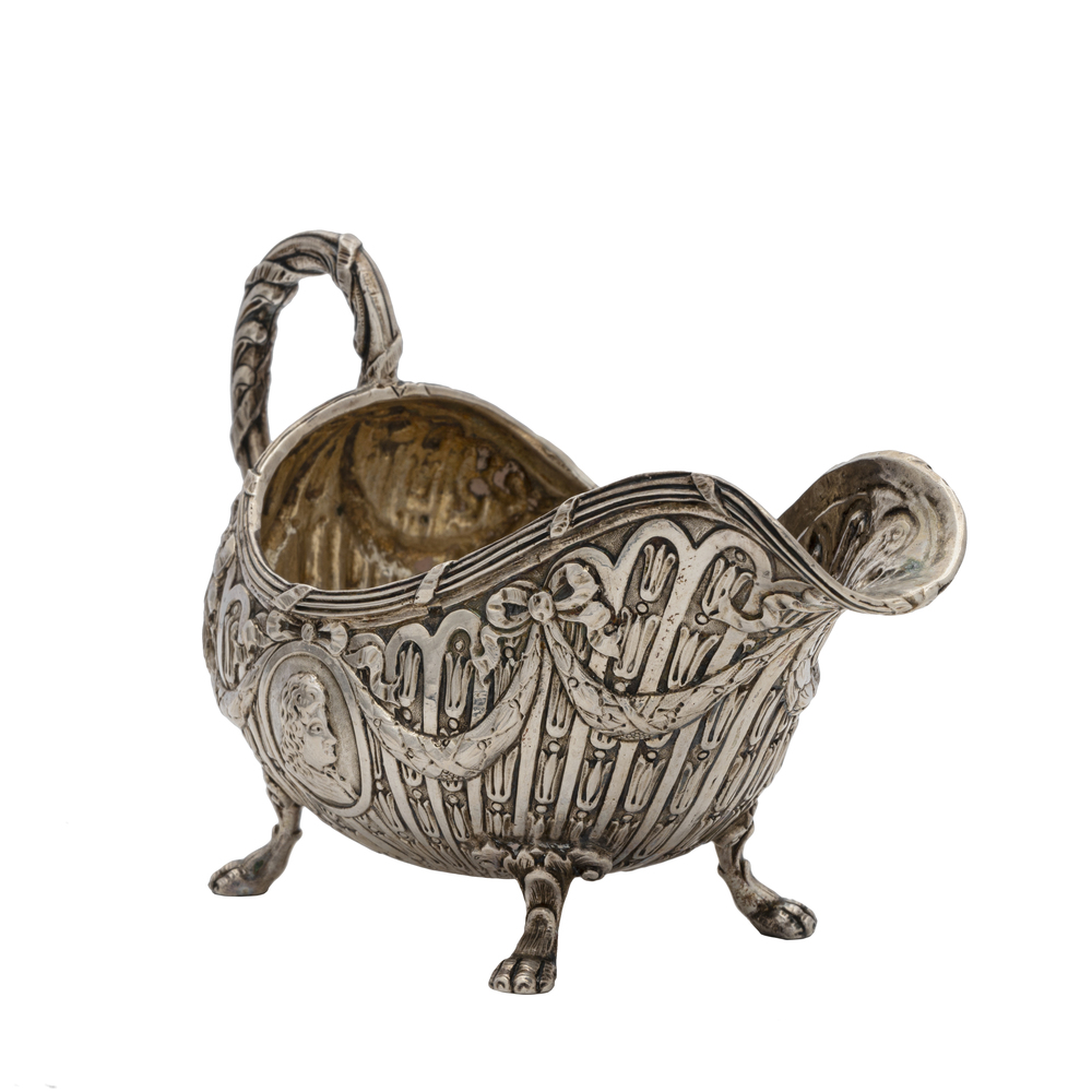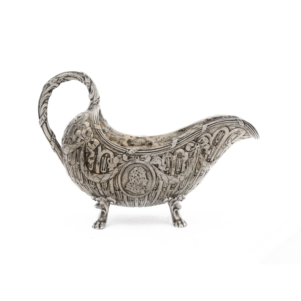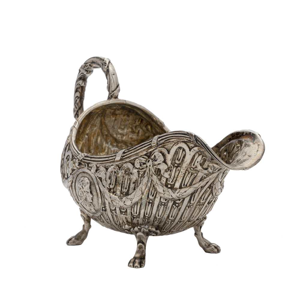 With festoon and medallion decorations, resting on four uprights in the shape of a feral paw