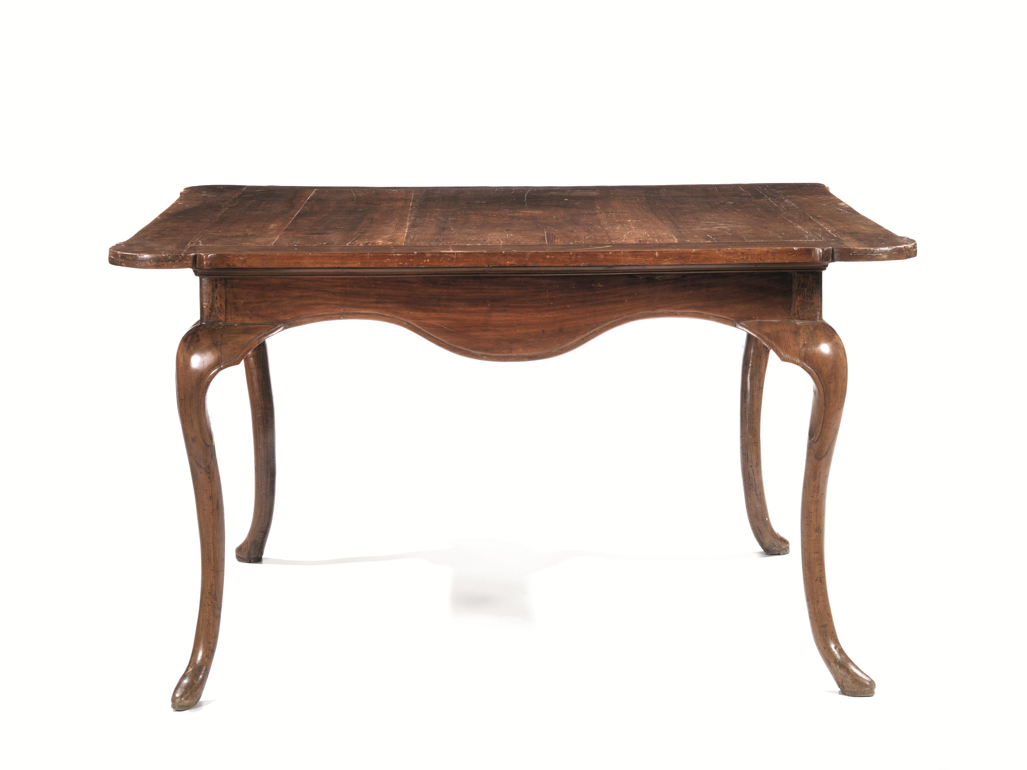 Tavolo da centro, Toscana, metà sec. XVIII, in noce, piano quadrato con angoli sagomati, fascia ondulata, gambe mosse su piedi a zoccolo stilizzato, cm 134x134x78, alcuni restauri