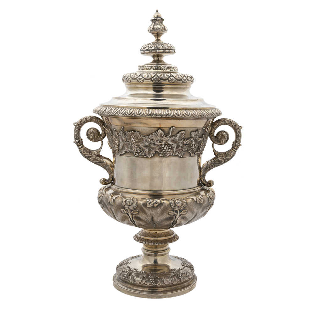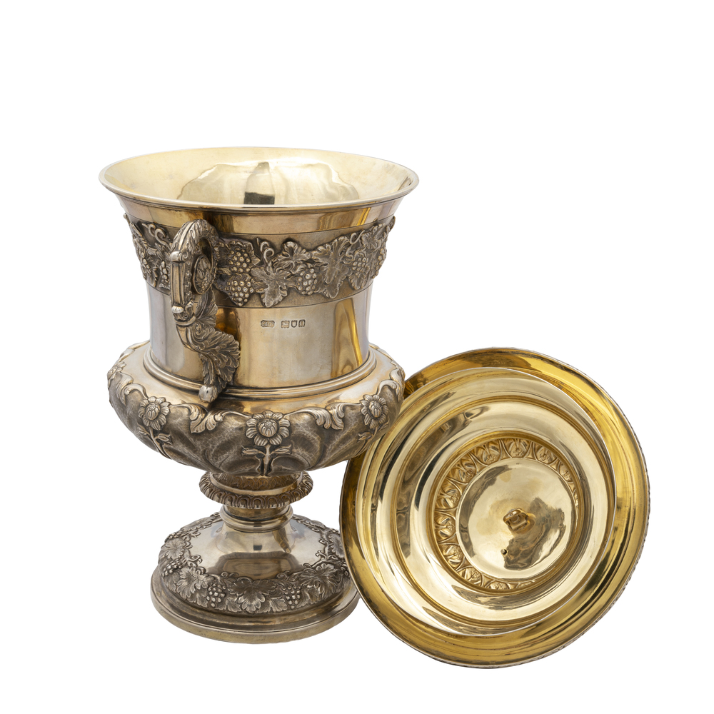 Coppa biansata in argento finemente lavorata con tracce di doratura