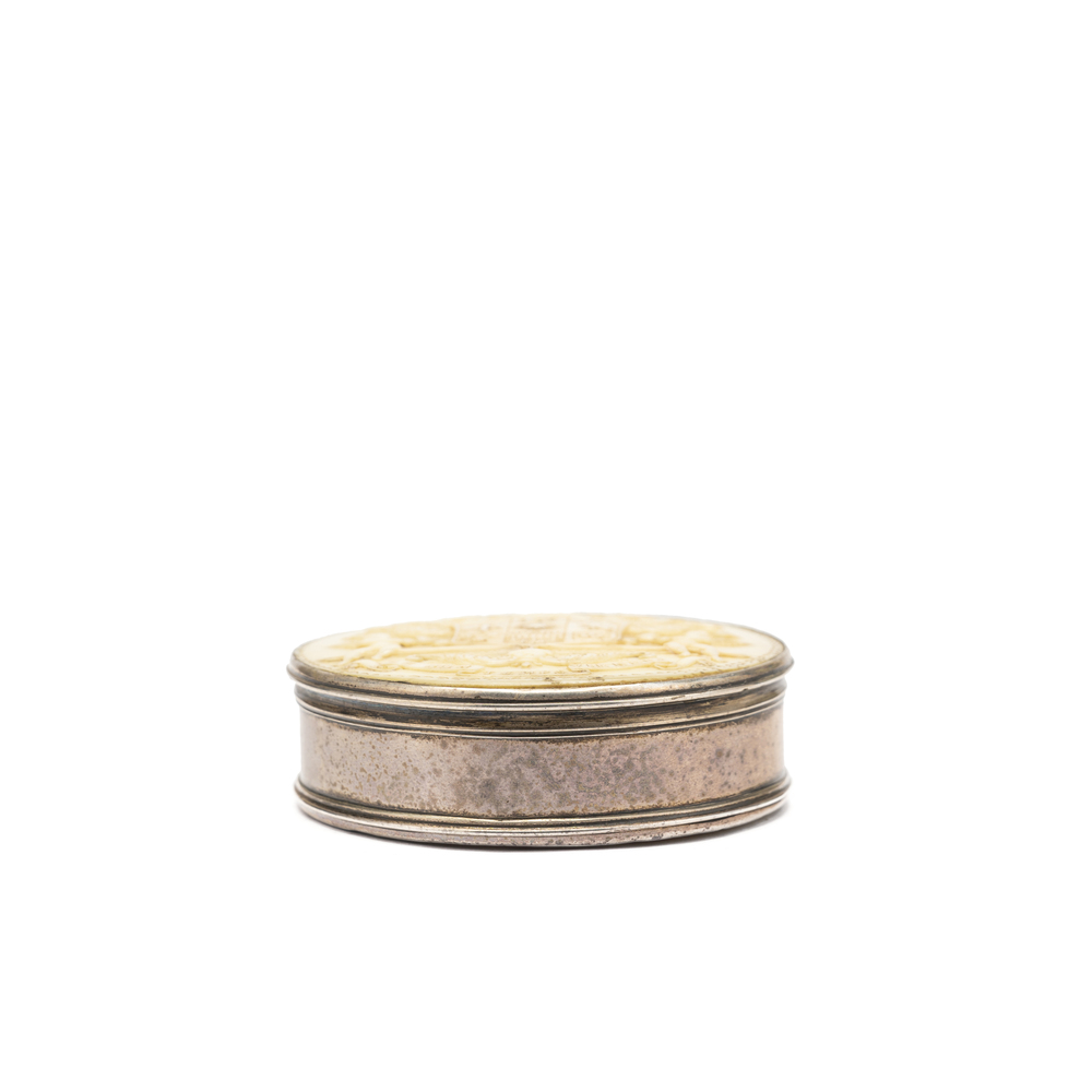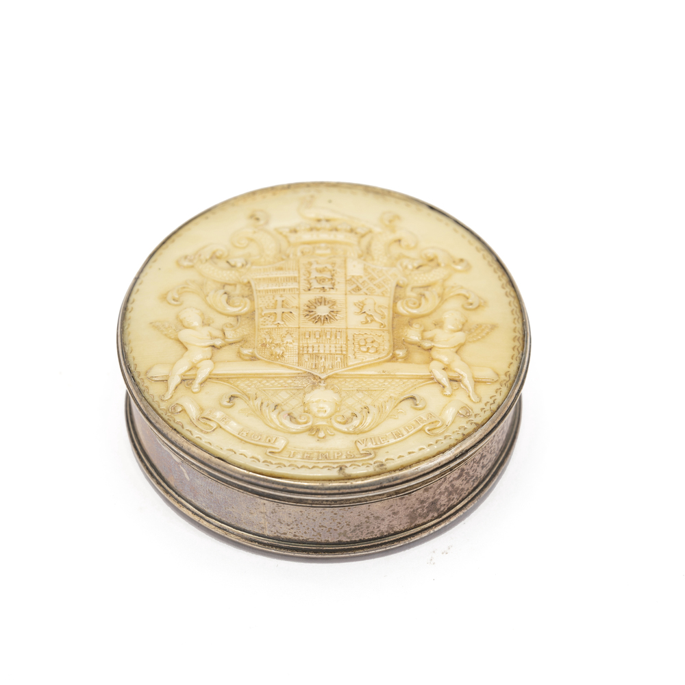 Body with worked ivory lid representing a noble coat of arms enclosed by scrolls and cherubs