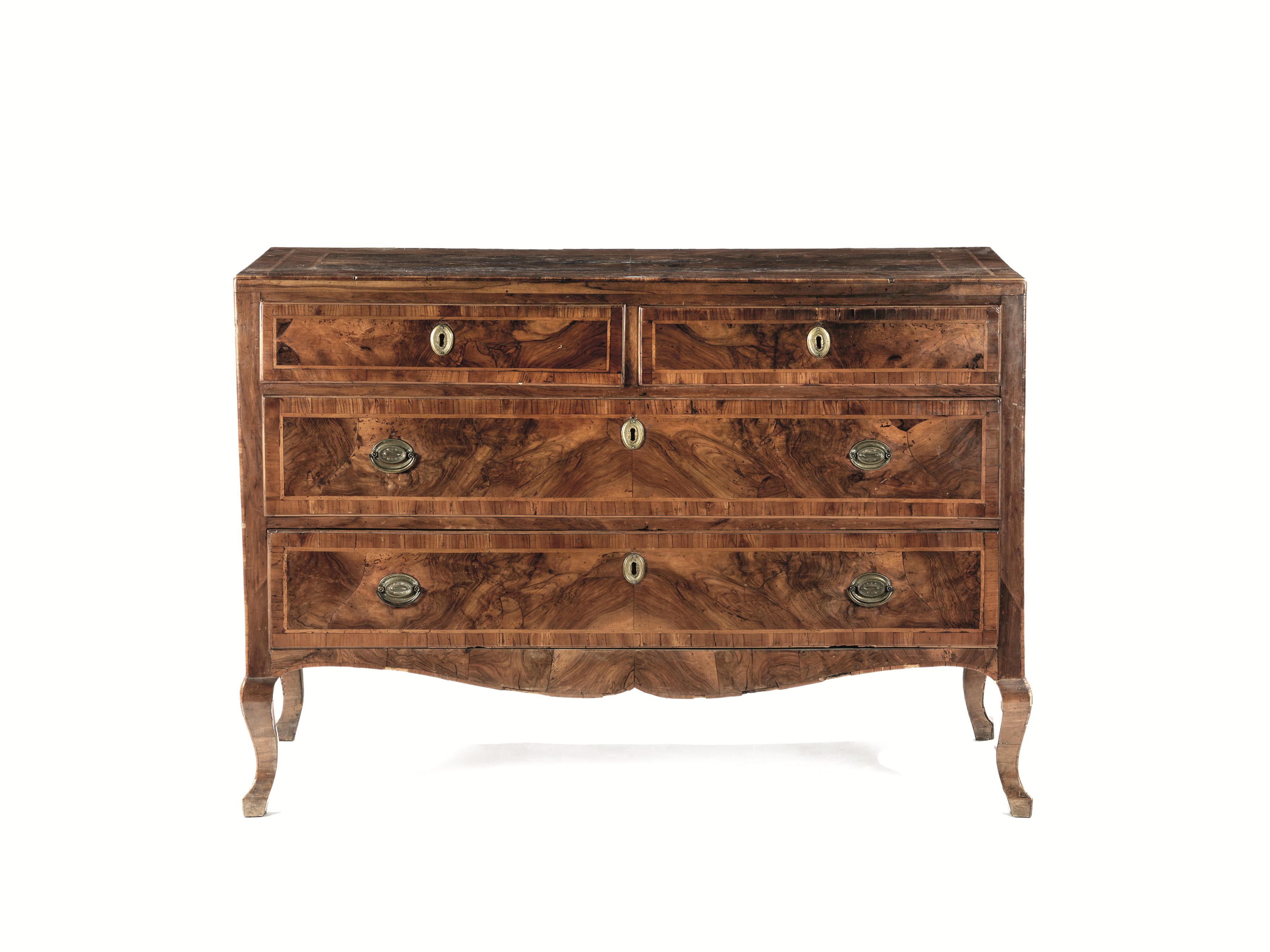 Cassettone, Toscana, ultimo quarto sec. XVIII, in noce e olivo filettati, piano rettangolare, due cassetti appaiati sotto al piano e due sottostanti, pendaglina sagomata frontale e laterale, gambe sinuose su piedi a zoccolo stilizzato, cm 125x53x88, piccoli danni e mancanze