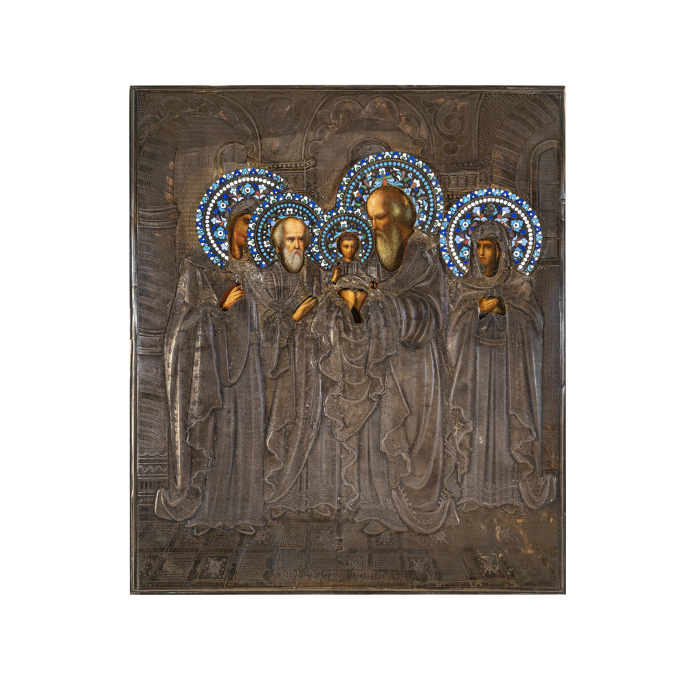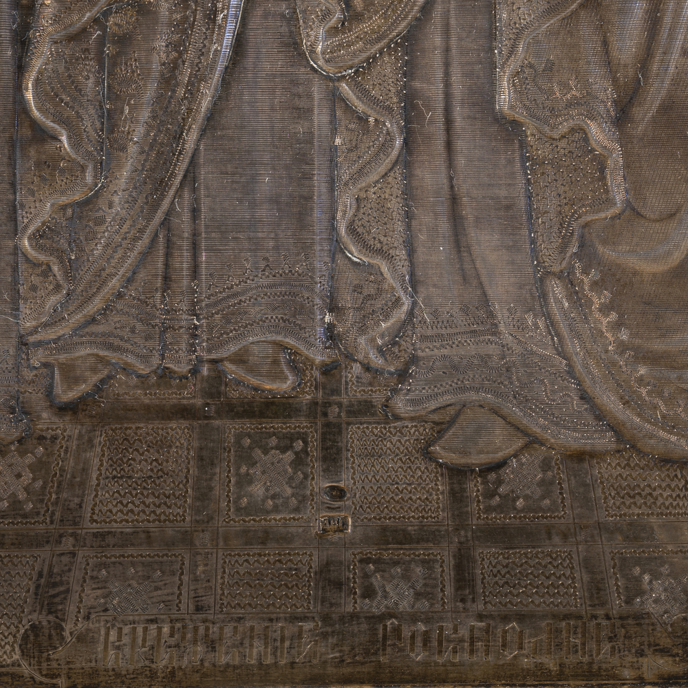 Raffinata tavola di fine 800, impreziosita da una riza in argento e smalti closoinné, tipici dell'oreficeria russa zarista. Di grande pregio il lavoro incisorio sulla lamina argento che raffigura l'interno del tempio in cui si svolge la scena