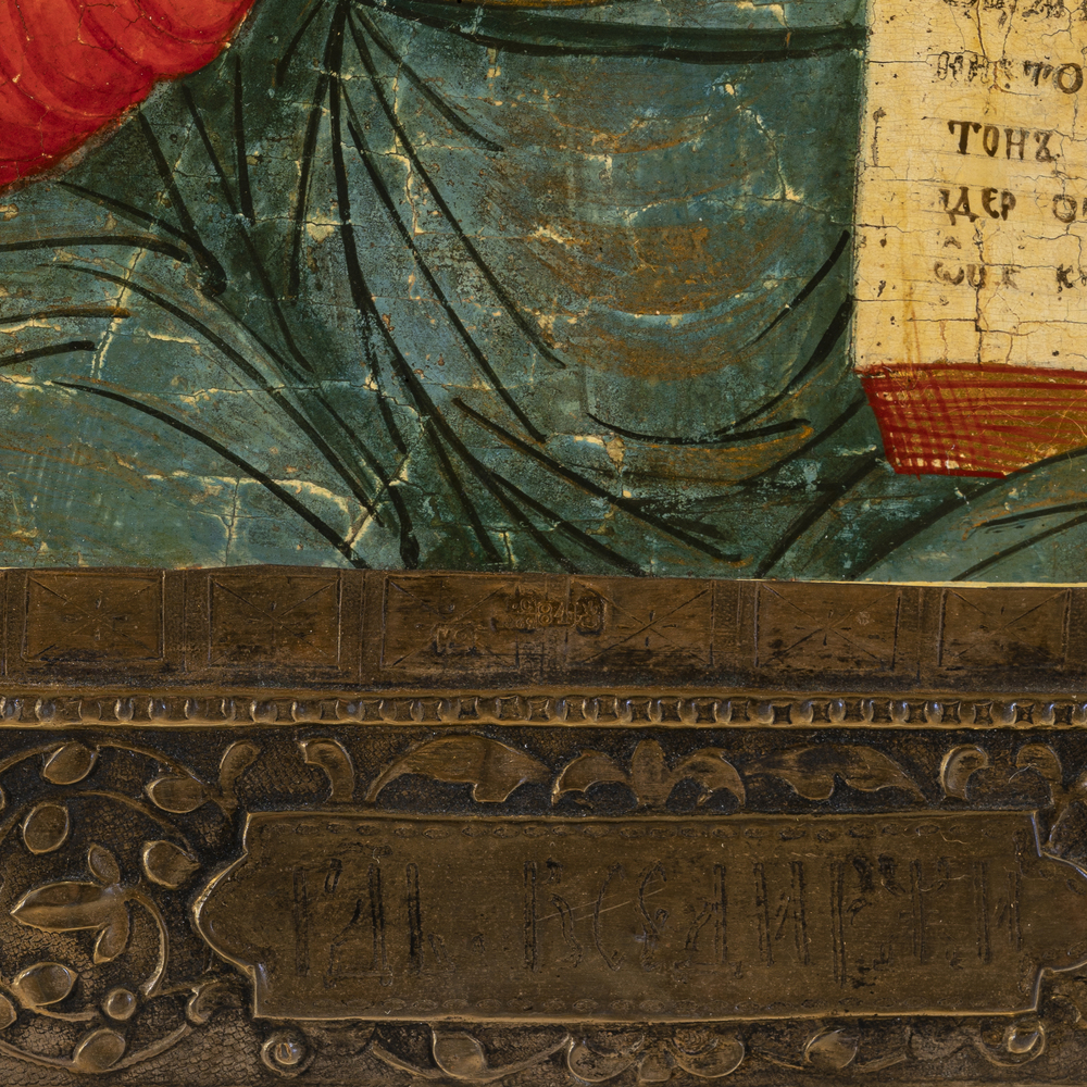 La bella immagine del Pantocrator è arricchita, sui bordi da quattro santi di famiglia, e agli angoli dalle rappresentazioni dei quattro Evangelisti. Raffinata esecuzione databile alla fine del XVIII secolo e vicina ai modelli delle scuole iconografiche moscovite, è completata dalla basma e dall'aureola in argento sbalzate con bei motivi vegetali e geometrici