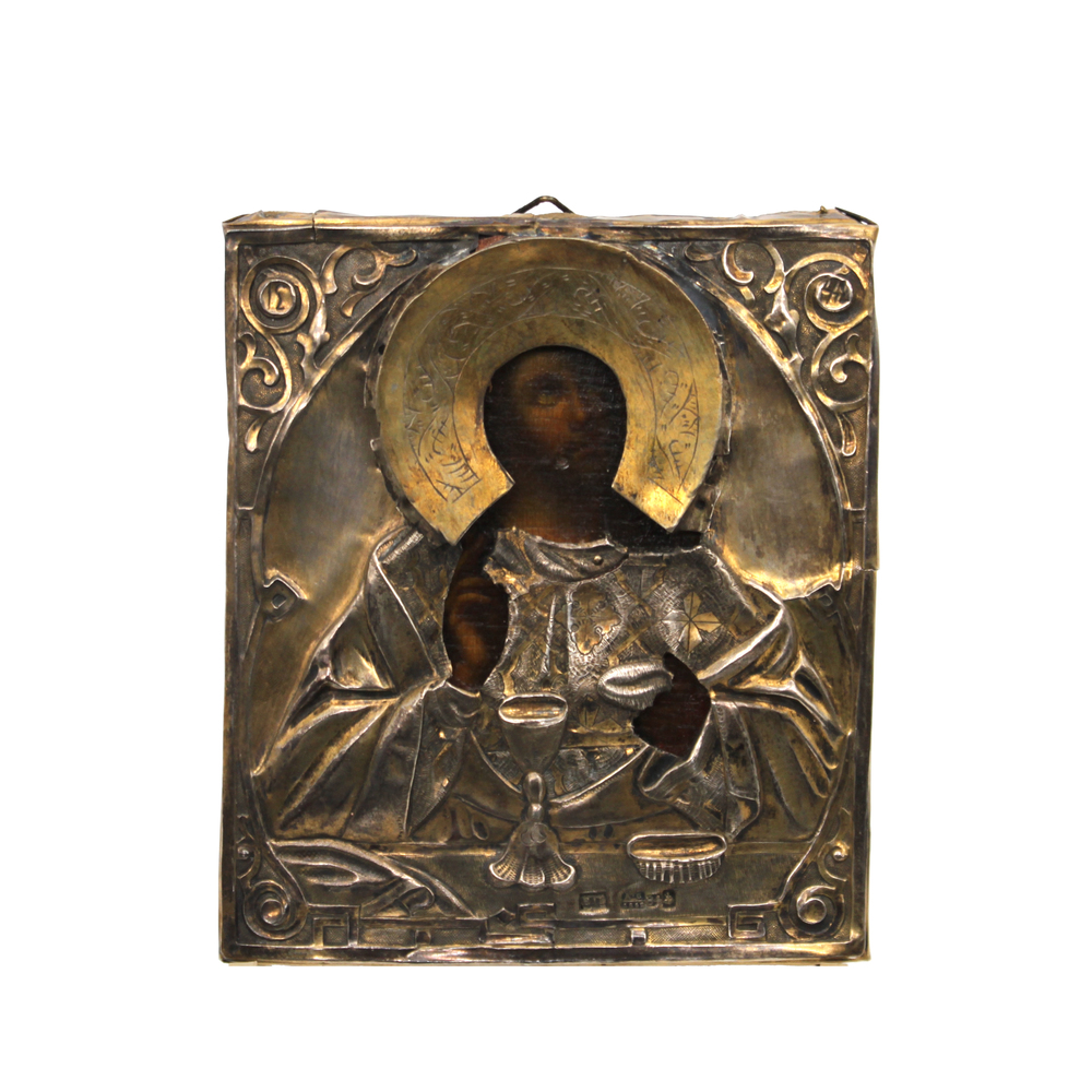 Particolare icona raffigurante il Cristo Benedicente con il calice dell'Eucarestia. L'esecuzione ad olio porta la datazione della tavola sul finire del XIX sec., quando si iniziò a dipingere con questa tecnica ottenendo così volti più intensi e addolciti. Si cominciò, inoltre, a dare più importanza alla bellezza e alla ricchezza della riza rispetto a quella della parte dipinta, tanto che con l'andare del tempo la pittura si ridusse alla realizzazione completa solo delle parti non coperte dal prezioso involucro