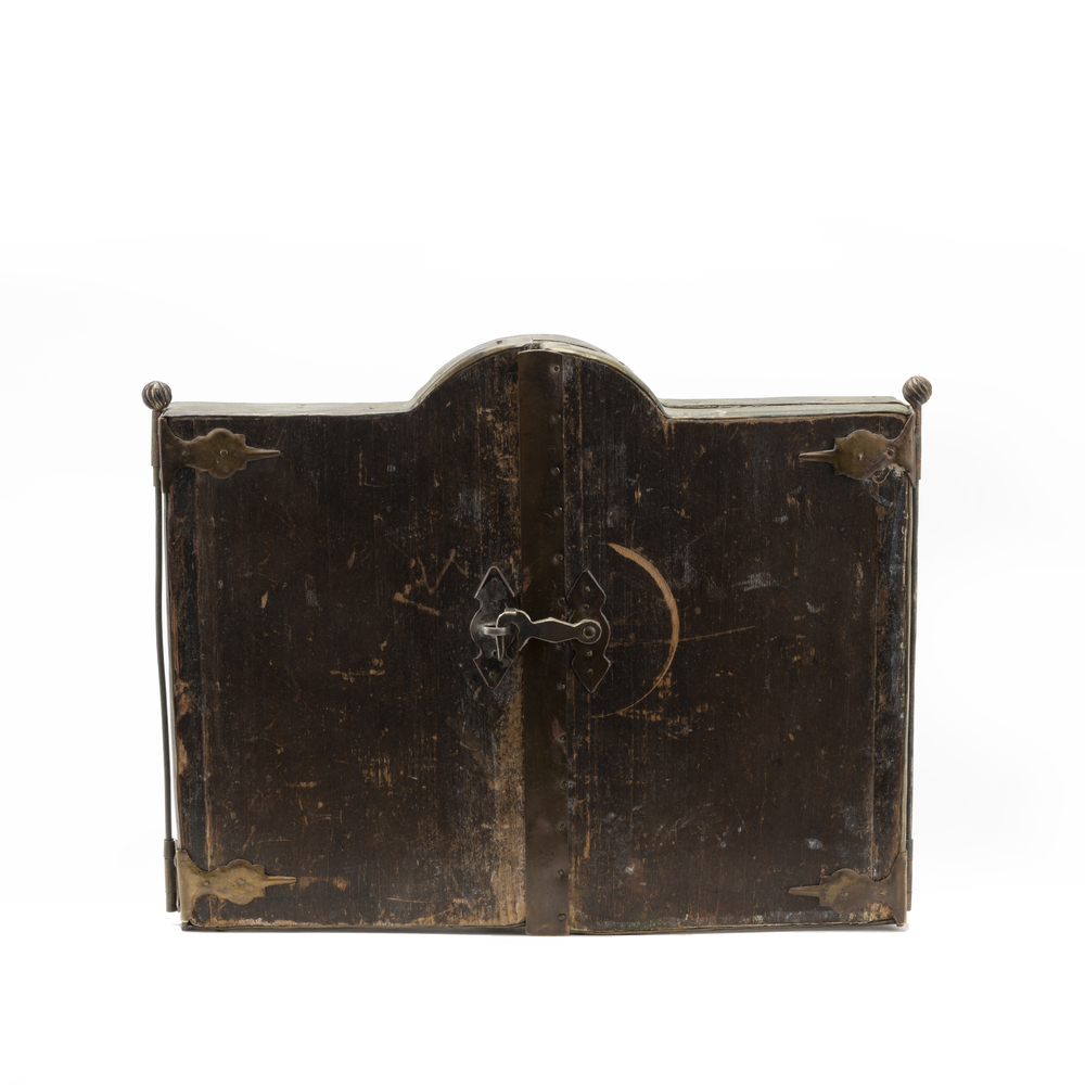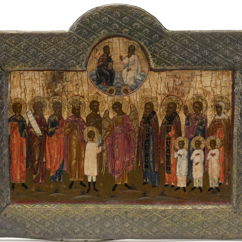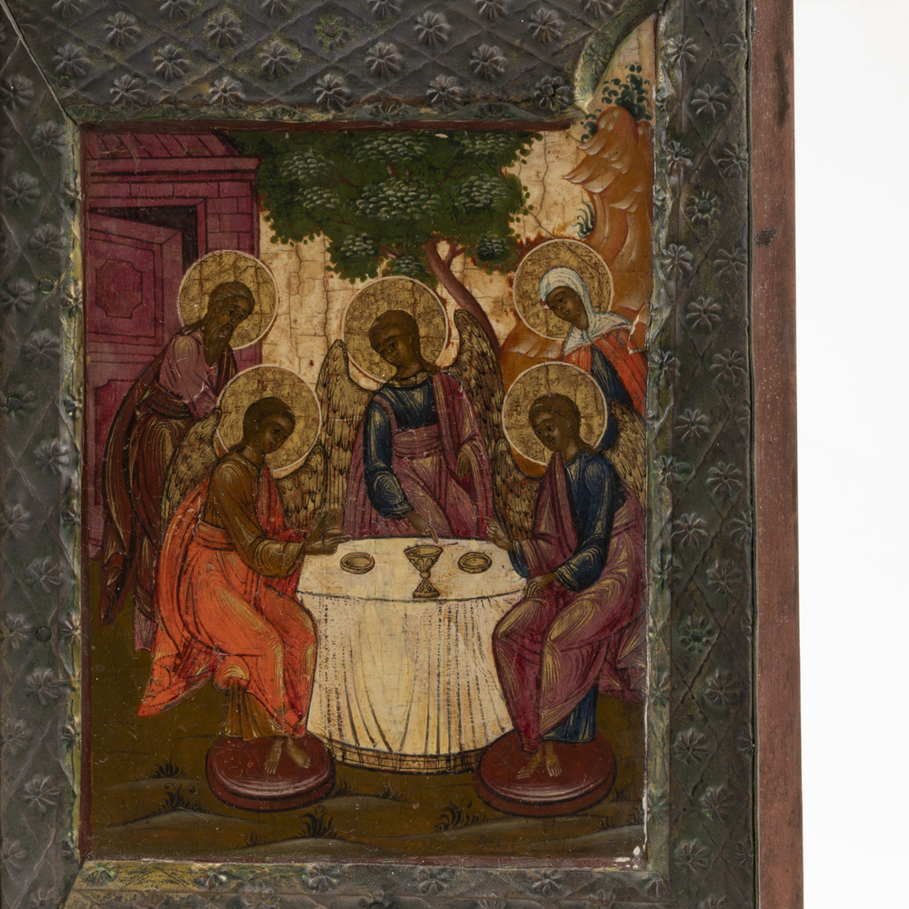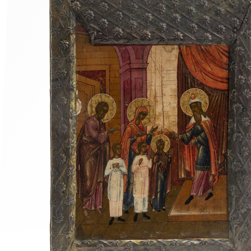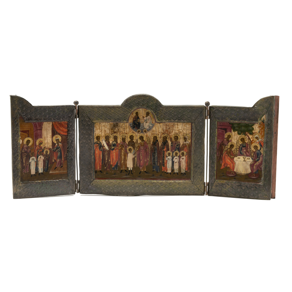 Raffinato trittico raffigurante la presentazione di Maria al tempio, un corteo di Santi Eletti e la Trinità dell'Antico Testamento con basma e struttura in metallo.