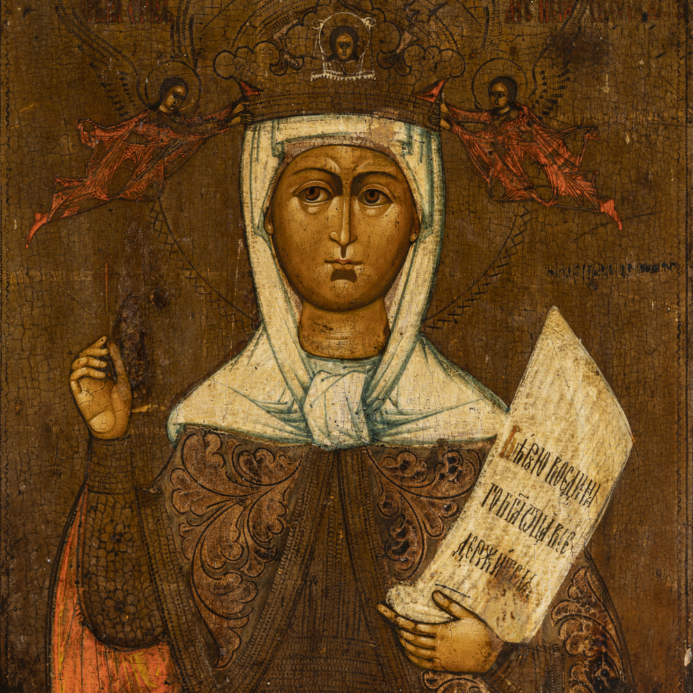 Tipica raffigurazione di S. Parasceva, con il crocifisso e la corona, su un fondo argento meccato e lavorato a bulino. Assolutamente particolare la soluzione degli angeli, che depongono sulla testa della santa la corona decorata con l'immagine del Mandilion