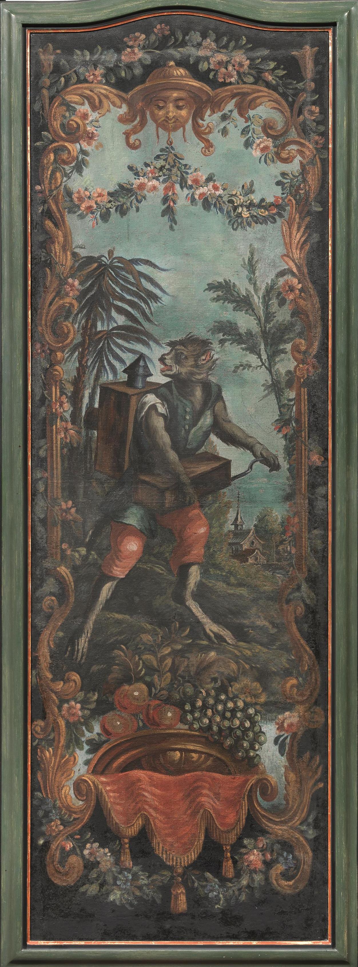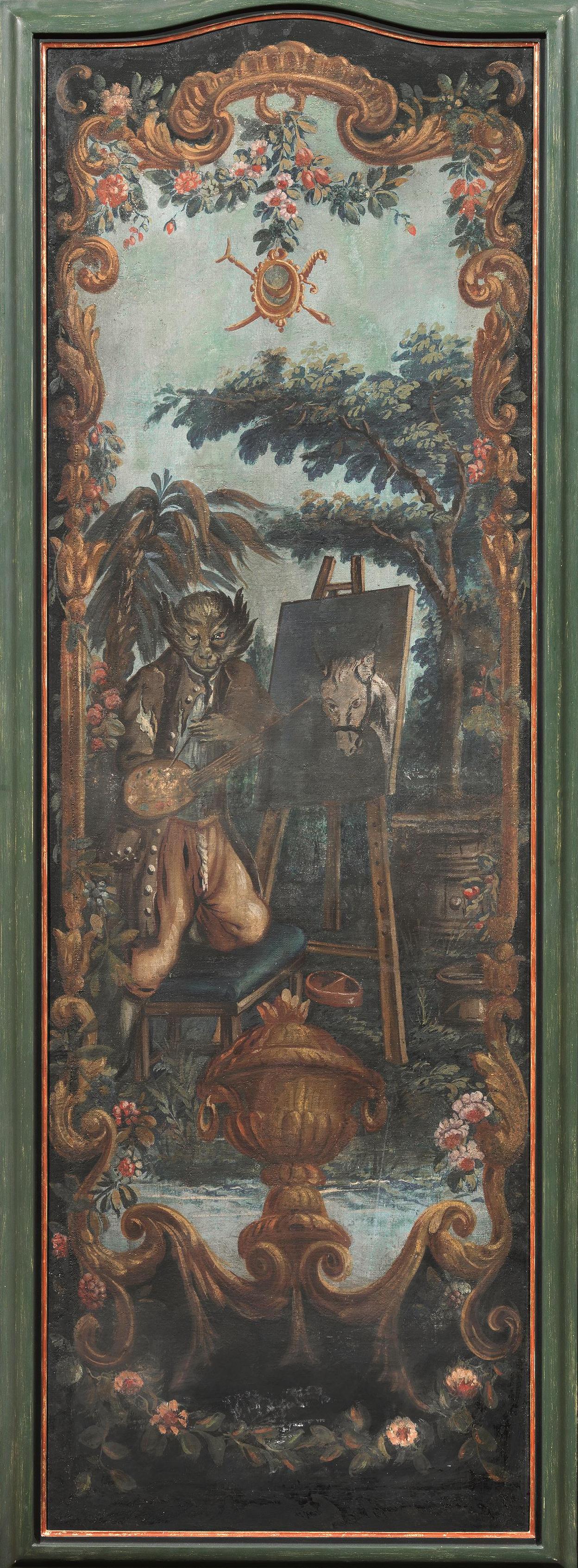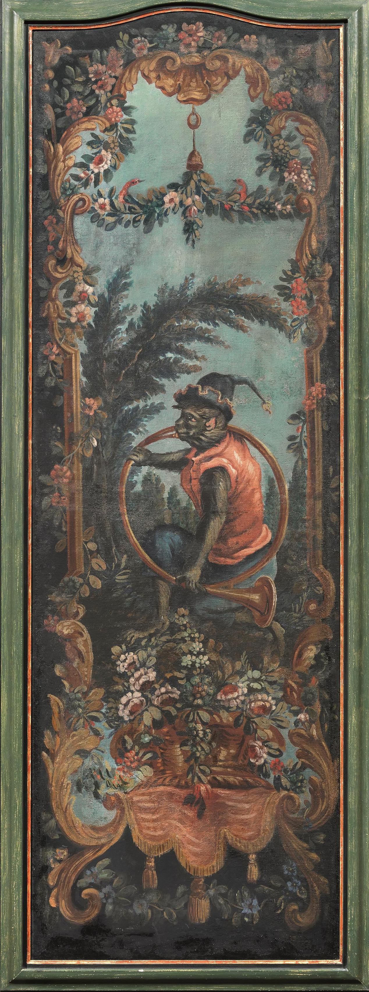 Sei ante di paravento, sec. XIX, in tela dipinta a raffigurare scimmie suonatrici entro riserve e quinte arboree, entro cornici in legno dipinto, cm 172x63, alcuni restauri (6)