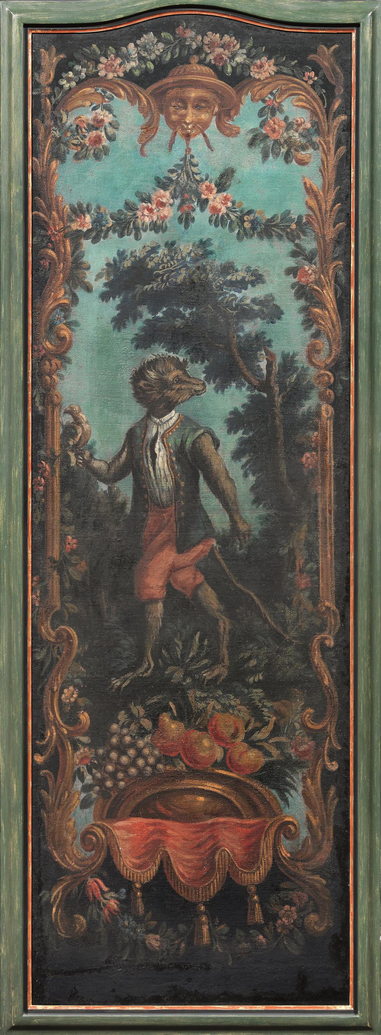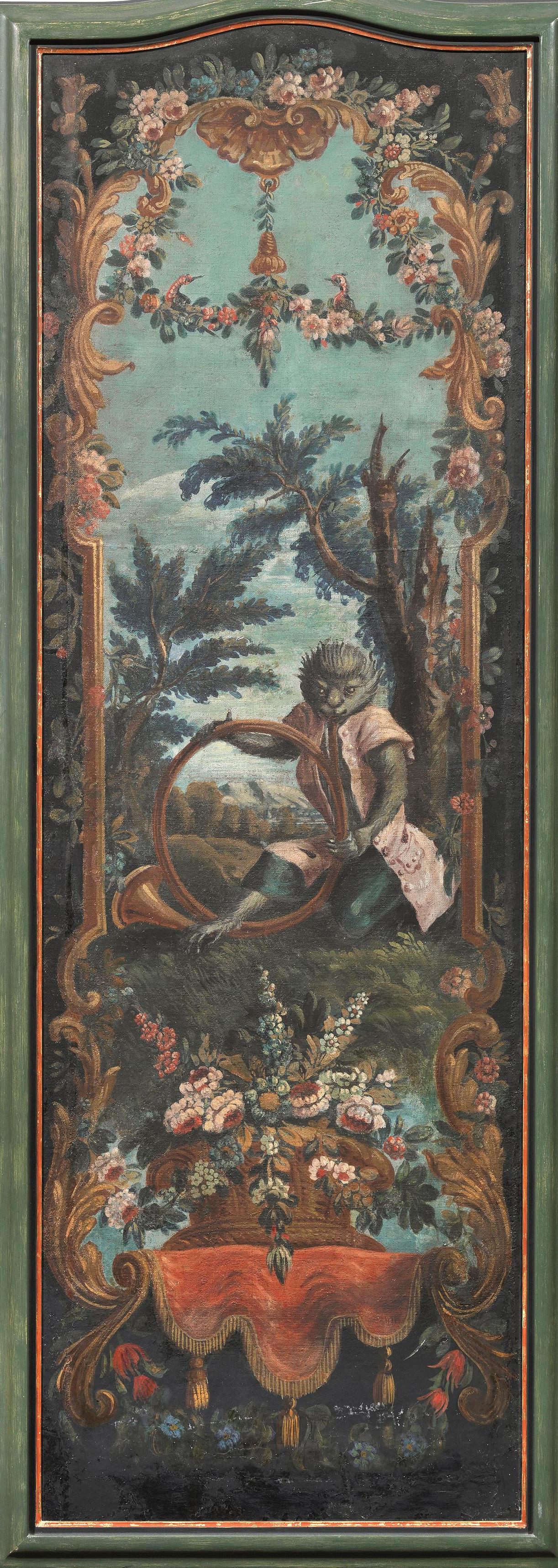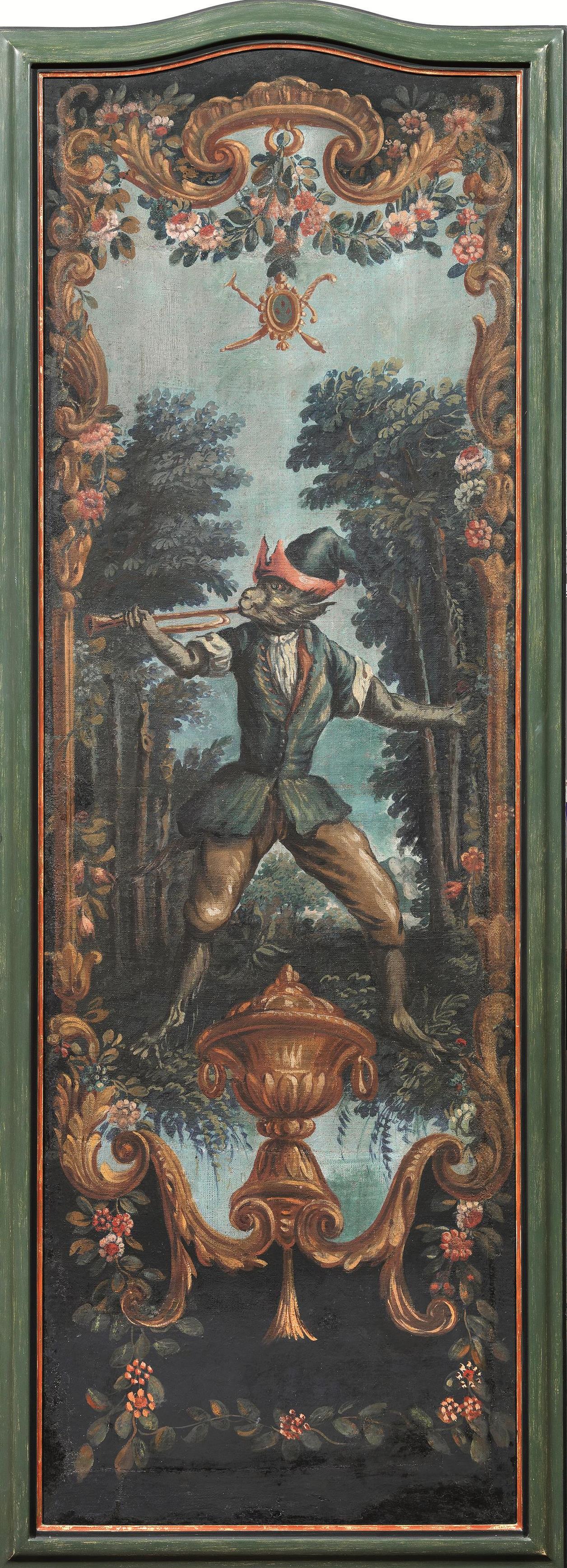 Sei ante di paravento, sec. XIX, in tela dipinta a raffigurare scimmie suonatrici entro riserve e quinte arboree, entro cornici in legno dipinto, cm 172x63, alcuni restauri (6)