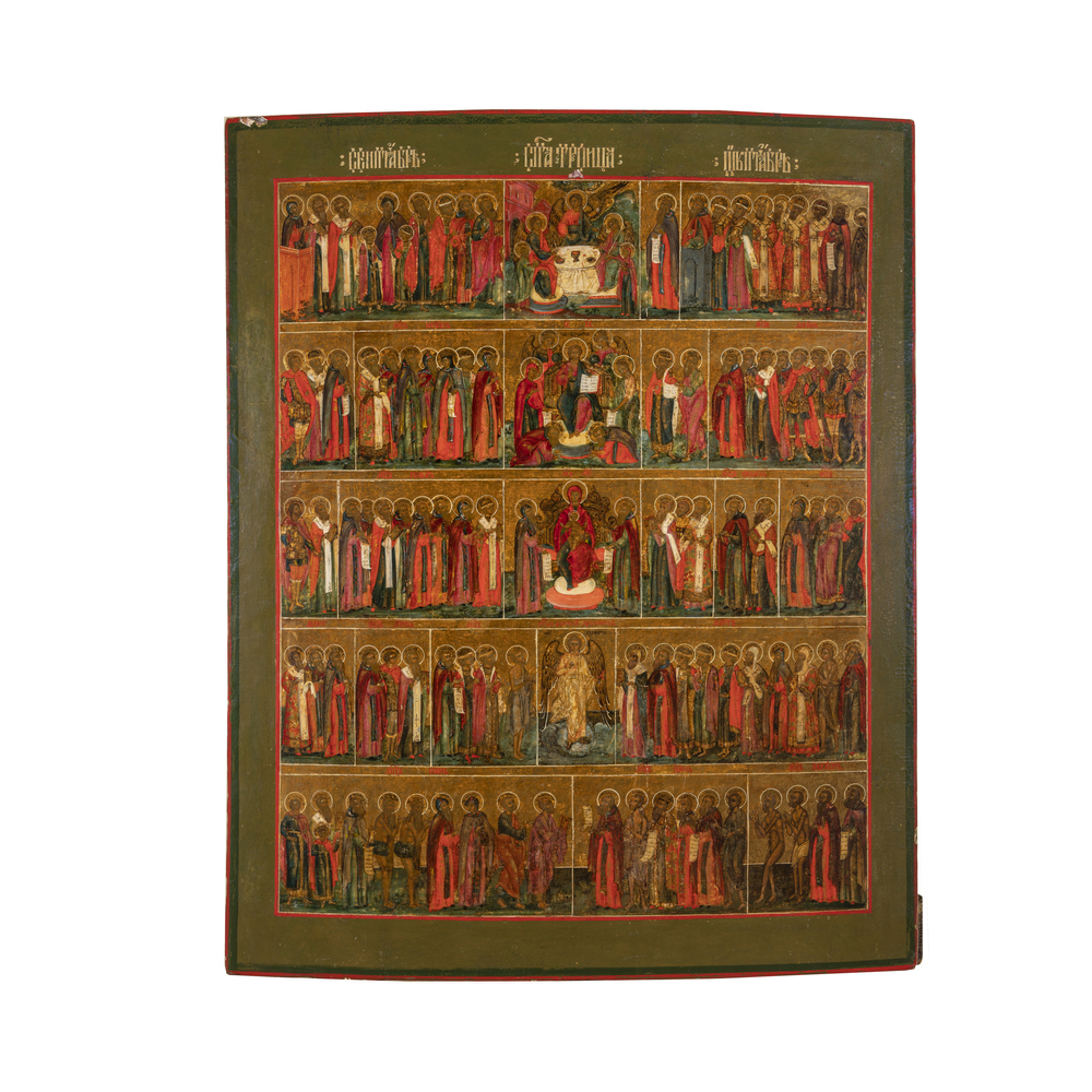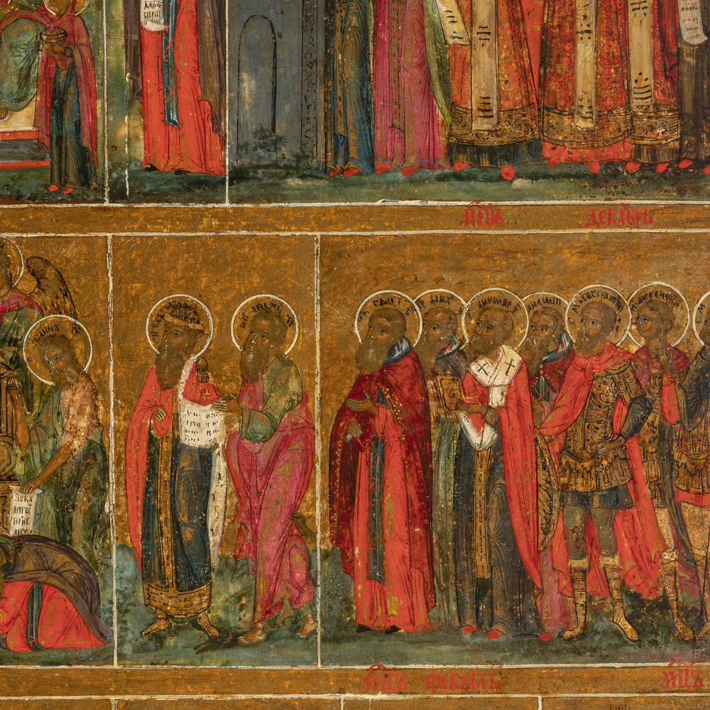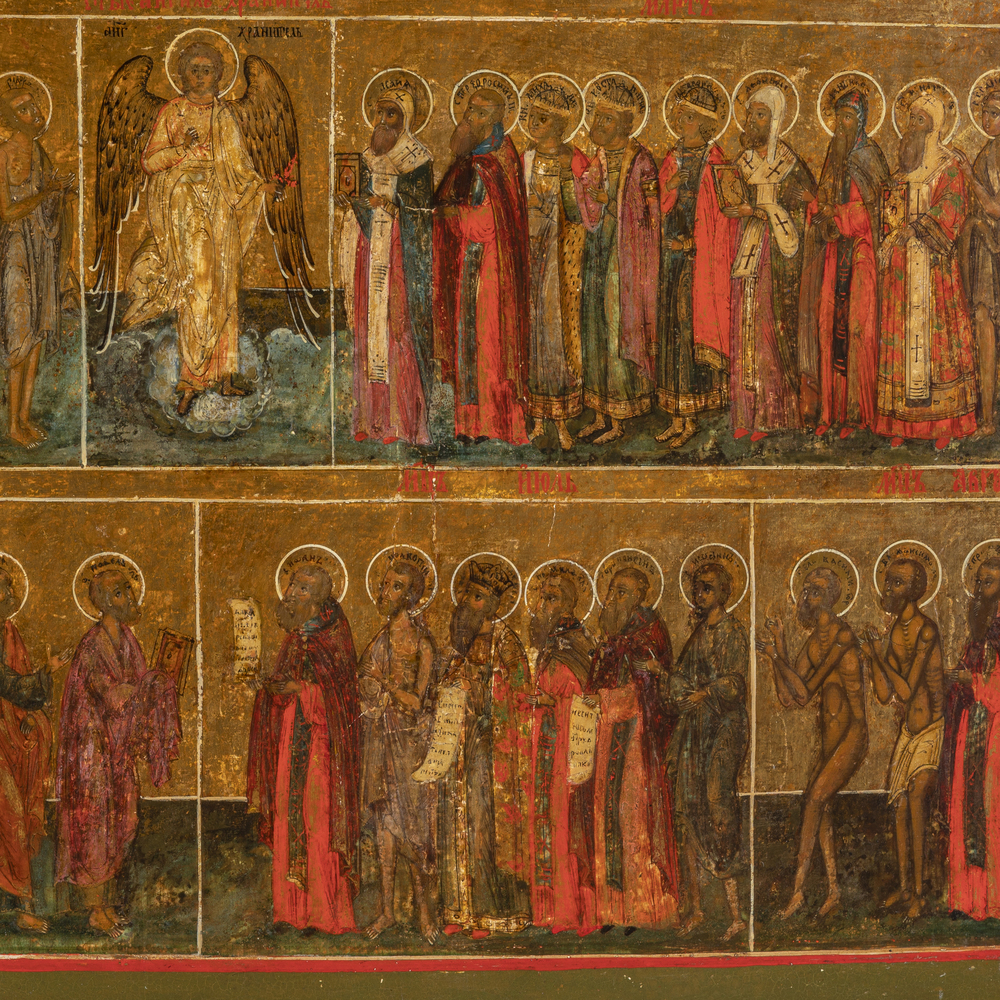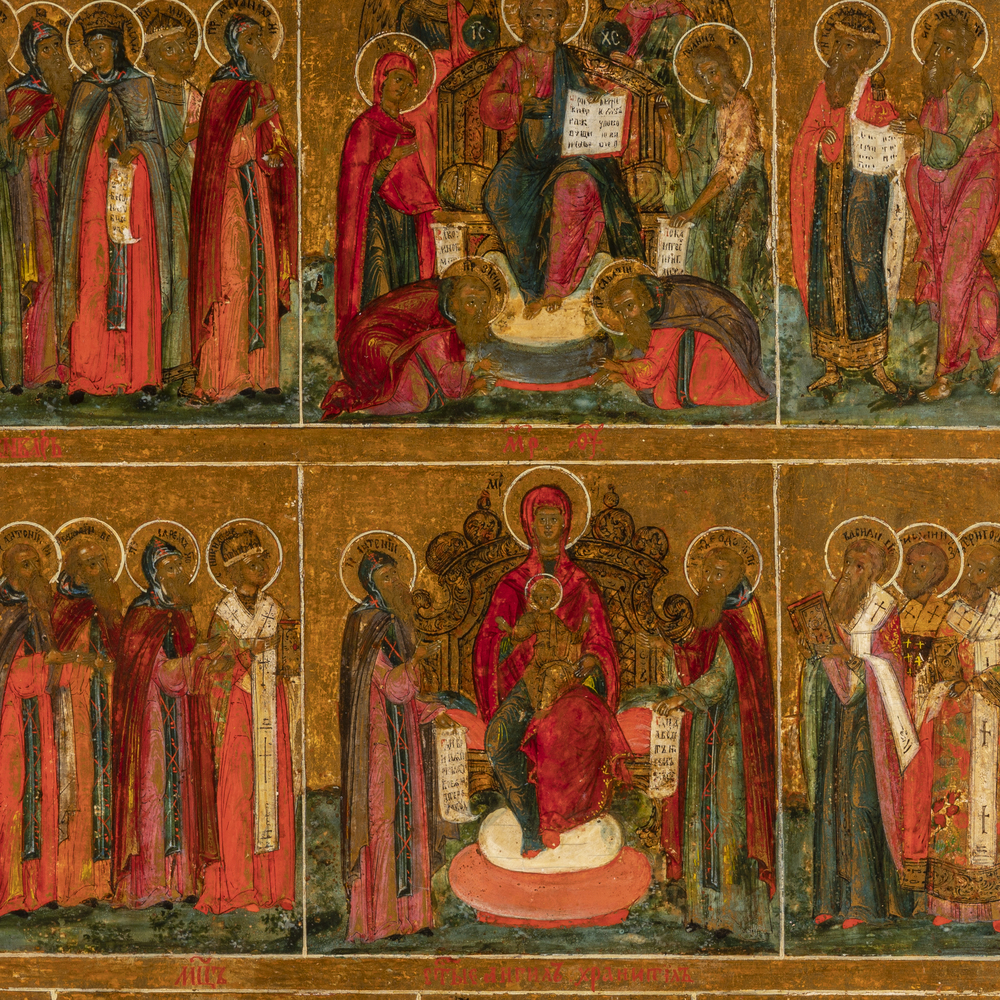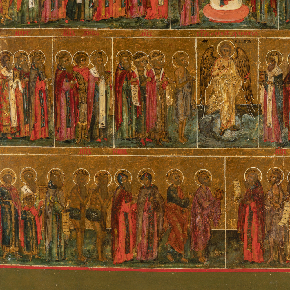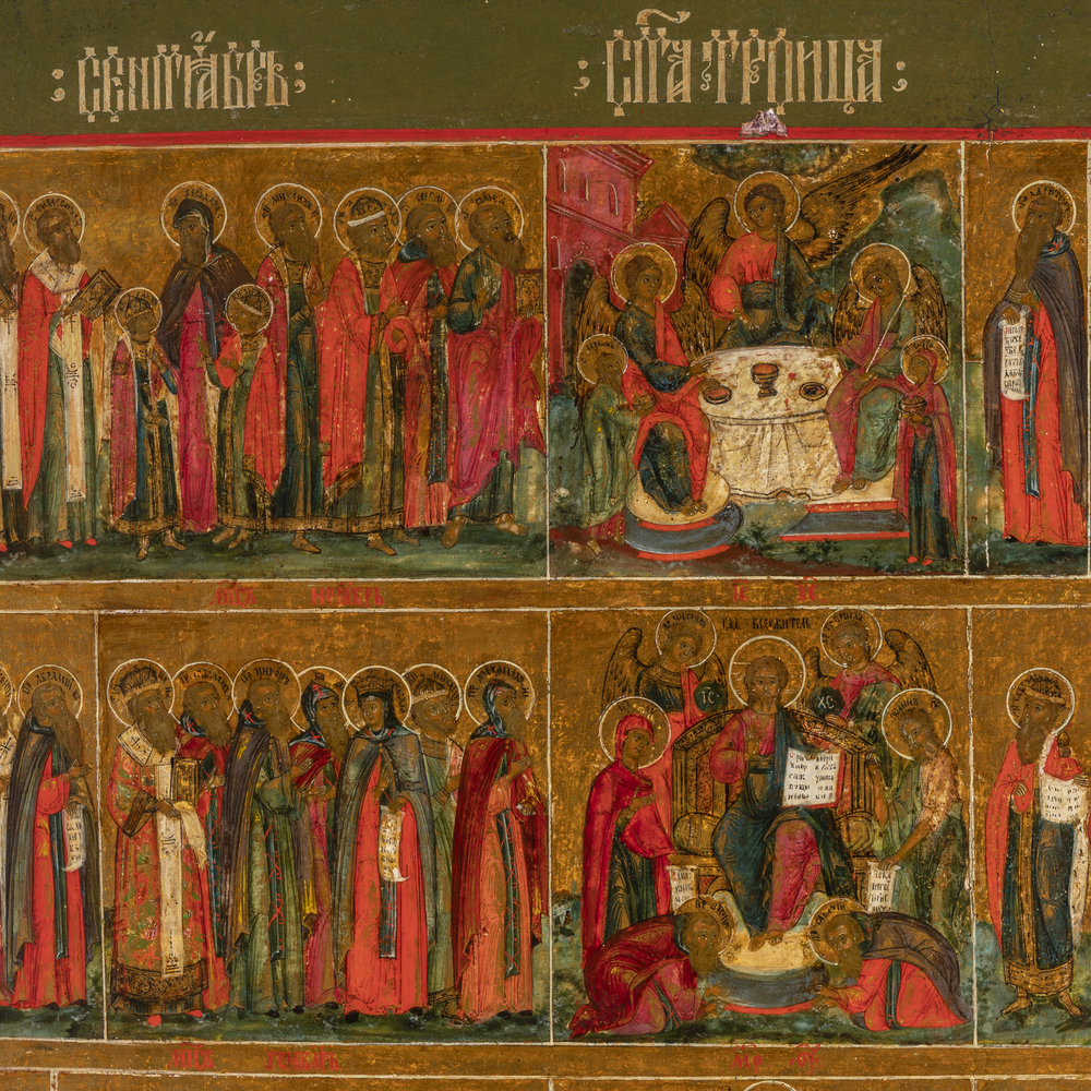 "Multipartite icon with chosen Saints and Trinity of the Old Testament"