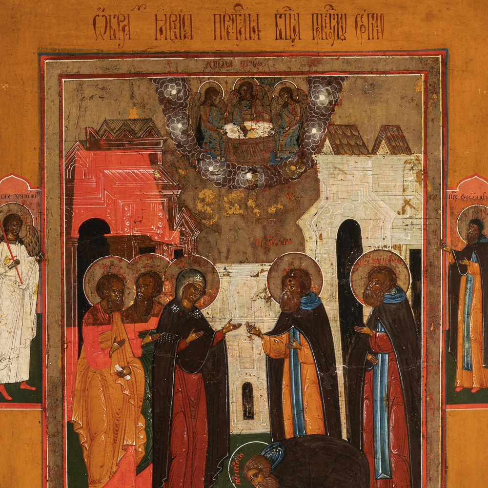 L'iconografia di questa tavola illustra l'apparizione della Madre di Dio a San Sergio di Radonez, uno dei santi più popolari e amati di Russia. Fu artefice della rinascita spirituale e morale del popolo russo oppresso dal potere dei tartari, e fondò la lavra della Trinità, dove pochi anni dopo la sua morte (1392) il monaco Andrej Rublev dipinse la famosissima icona della Trinità secondo l'Antico Testamento, vera sintesi teologica e spirituale degli insegnamenti di Sergio. Fu anche il primo santo russo ad avere la visione della Madre di Dio, da cui ebbero origine una serie di icone che raccontavano l'evento miracoloso, come appunto questa tavola. La scena si svolge davanti al monastero fondato dal Santo, e in alto è raffigurata la Trinità, detta anche “Ospitalità di Abramo”; in primo piano, a sinistra, la Vergine accompagnata dai S.S. Pietro e Paolo; a destra, San Sergio e due confratelli; sui bordi l'Angelo Custode e un Santo. La tavola, con un bel fondo argento meccato e la culla sottolineata dalla cornice, mostra uno stile vicino ai centri di produzione dell'area centrale della Russia, molto interessanti le architetture sullo sfondo
