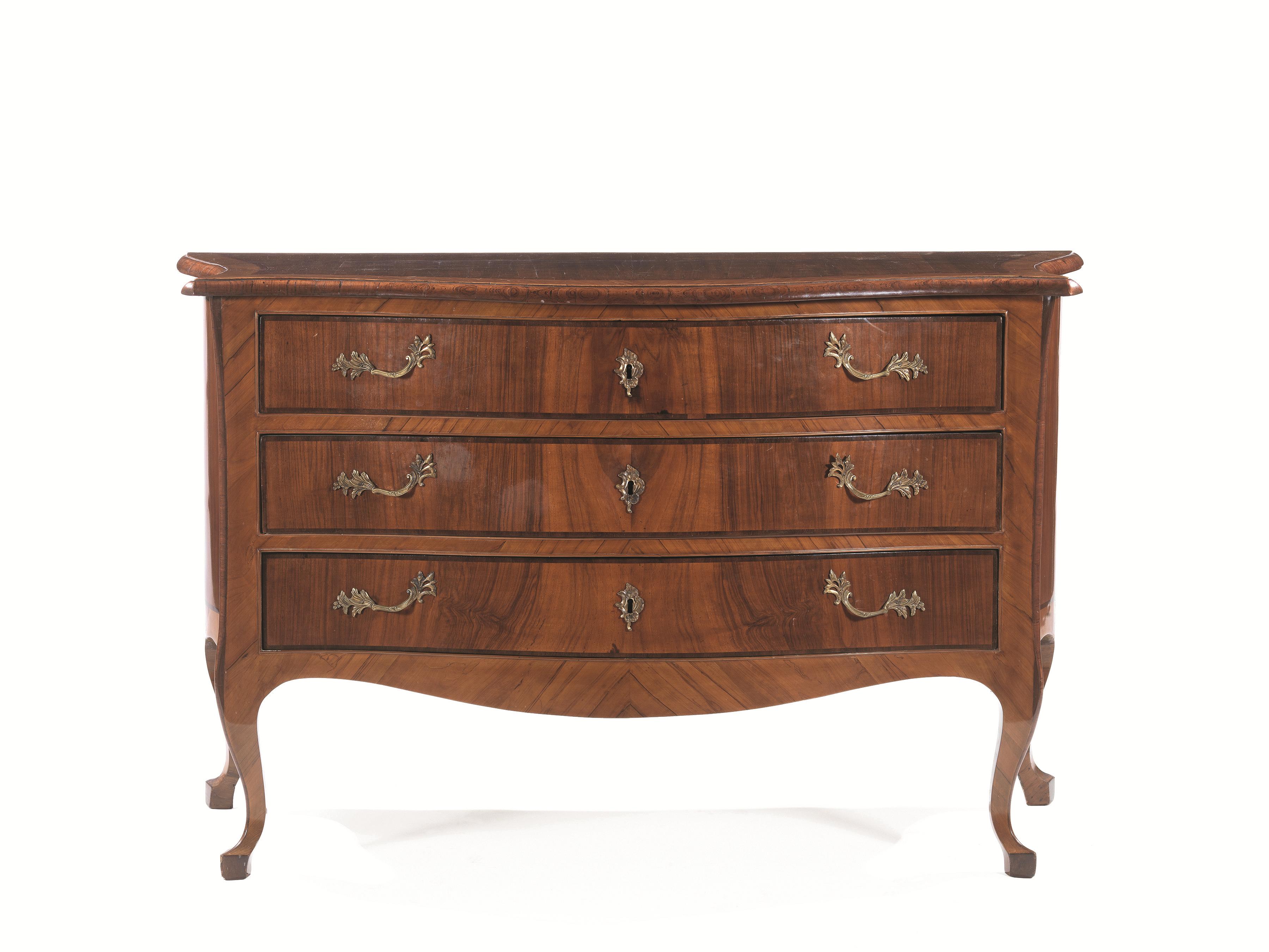 Cassettone a balestra, Firenze, ultimo quarto sec. XVIII, in noce e olivo filettati in bois de rose e palissandro, piano sagomato con becco di civetta, fronte e fianchi a doppia mossa, tre cassetti, pendaglina sagomata frontale e laterale, gambe sinuose su piedi a zoccolo stilizzato, cm 144x60x90