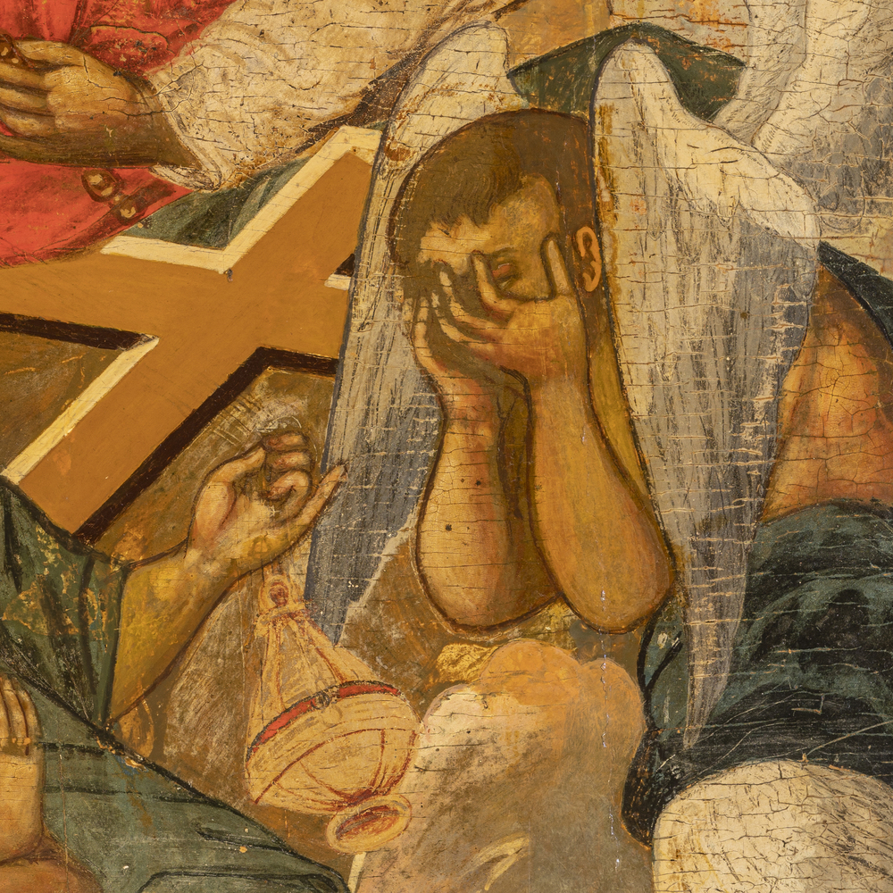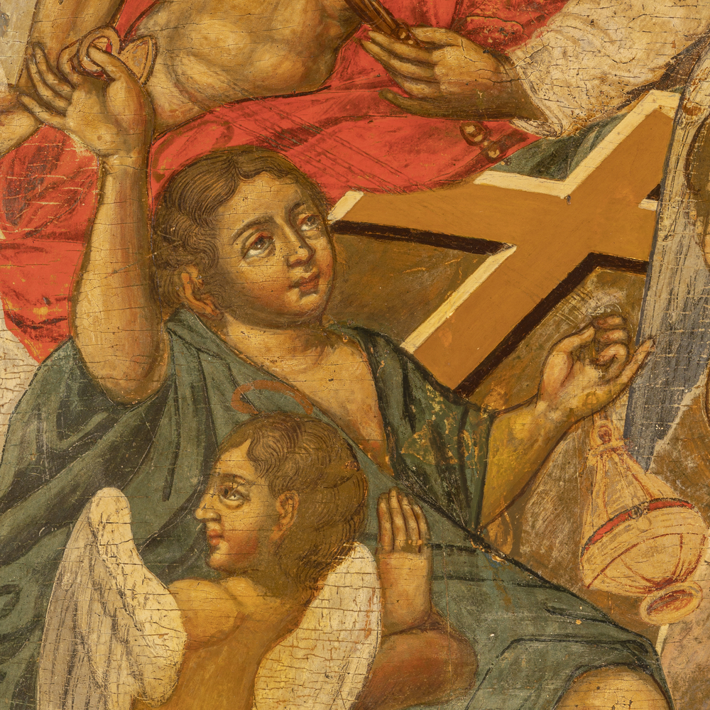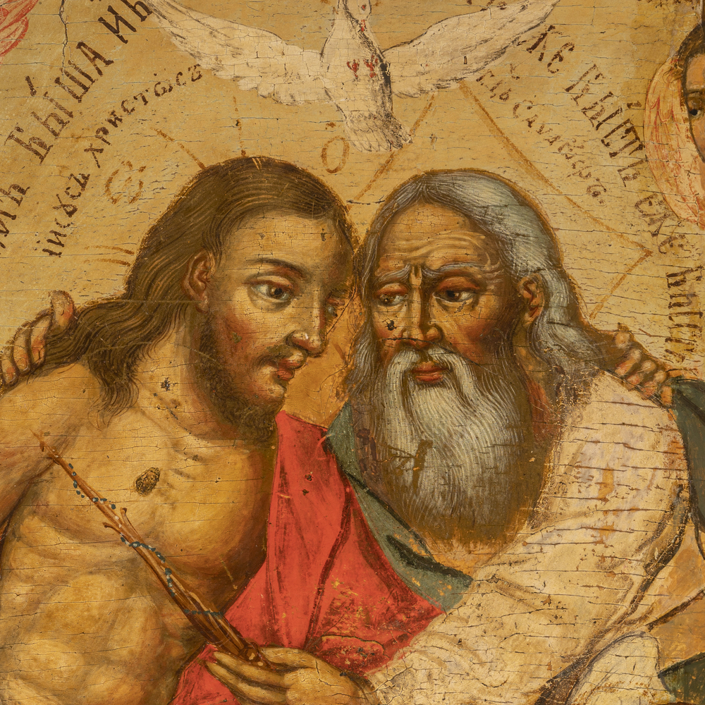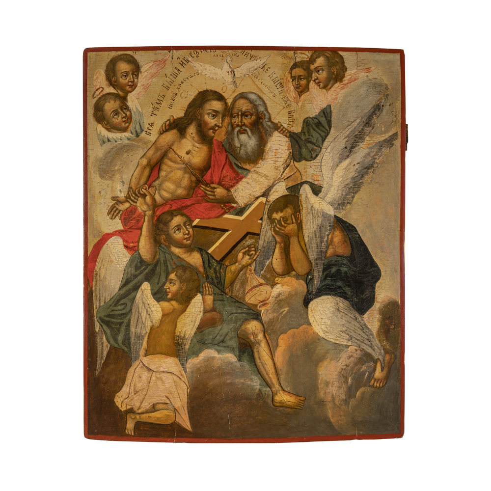 Inconsueta versione della Paternità fortemente influenzata dai modelli occidentali opera di un iconografo formatosi alle botteghe delle grandi città dove la tradizione antica aveva lasciato il posto alla contaminazione con la pittura detta “franca”. L'immagine mostra un tentativo di tridimensionalità e movimento delle figure e la cromia, tutta giocata sui toni rosati, rompe gli schemi formali dell'arte russa