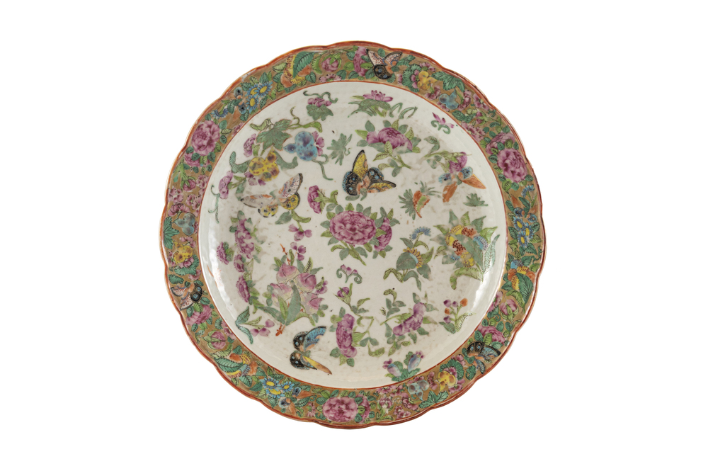 A pair of porcelain plates decorated with flowers and butterflies