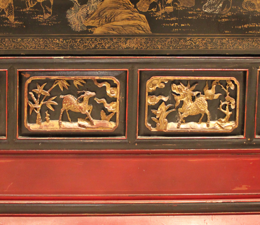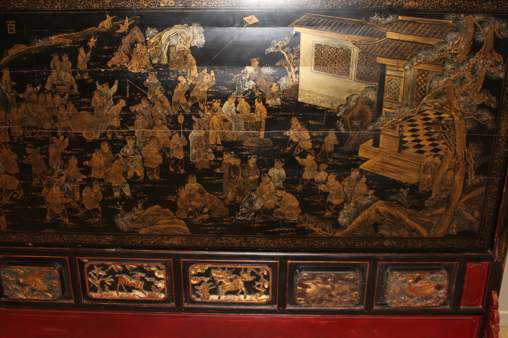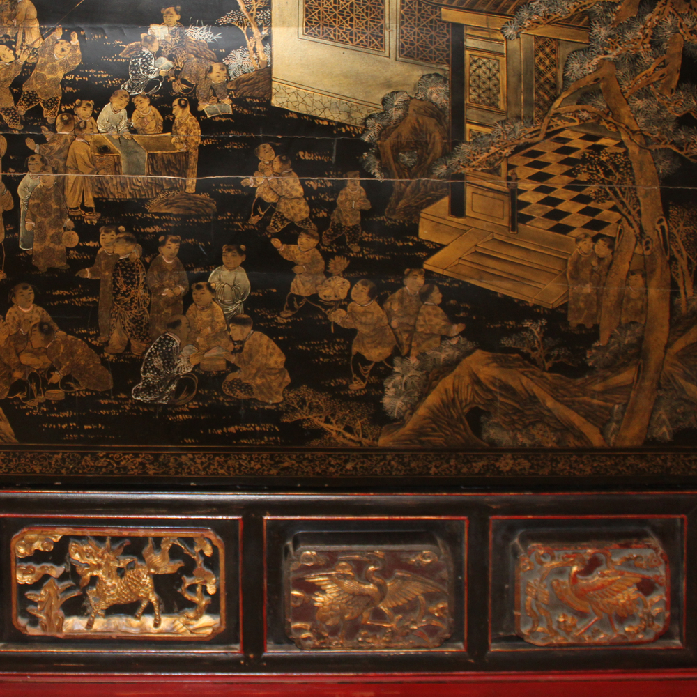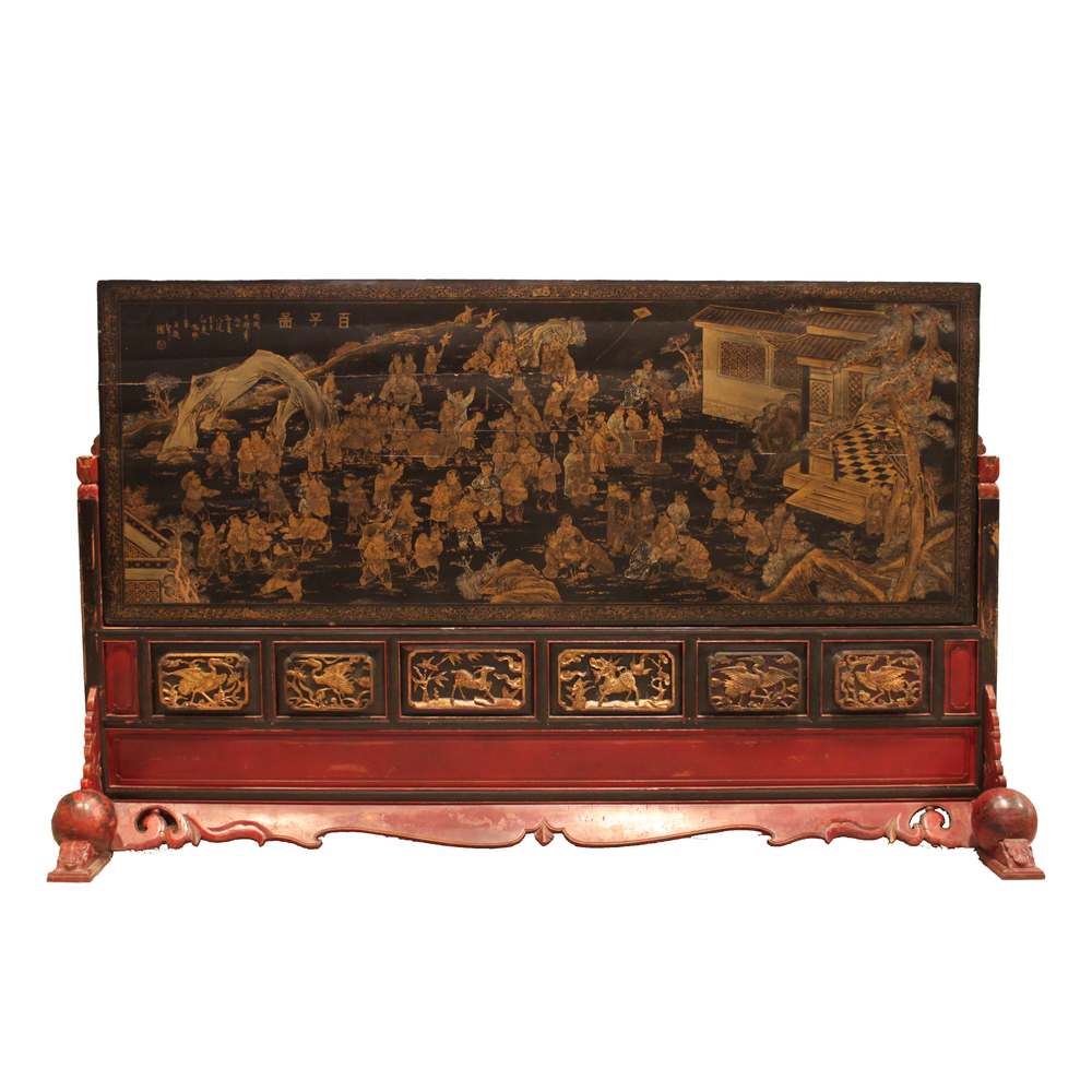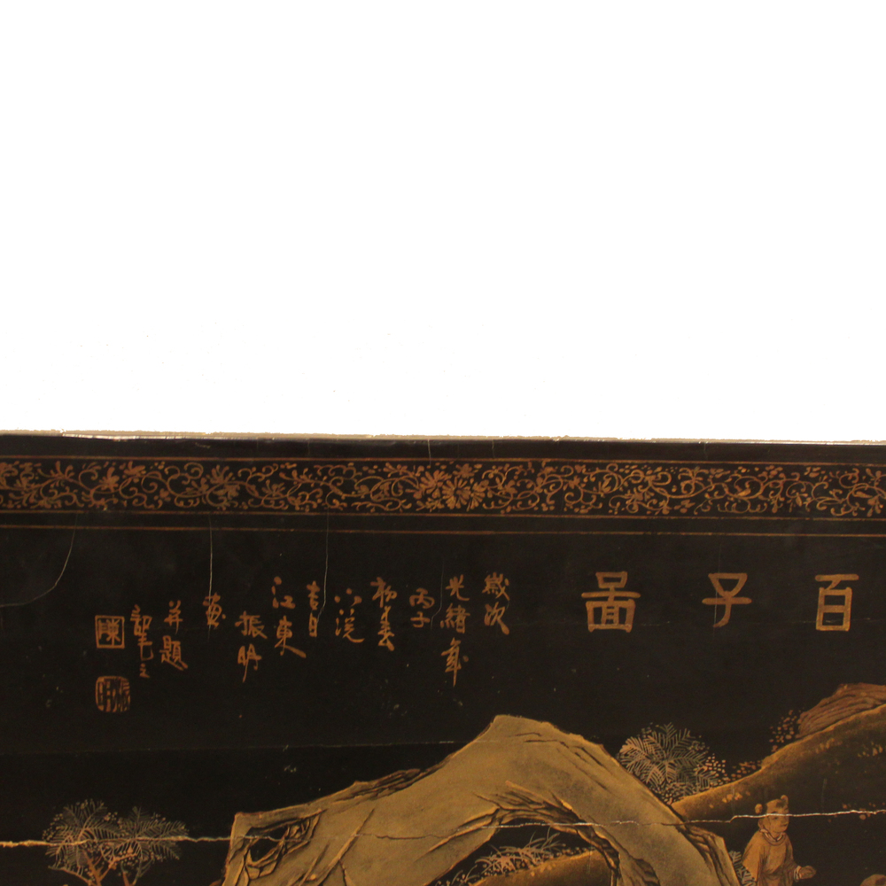 Pannello in legno laccato nero finemente dipinto in foglia d'oro