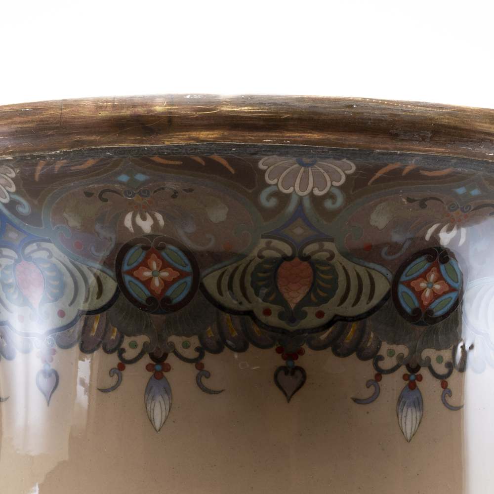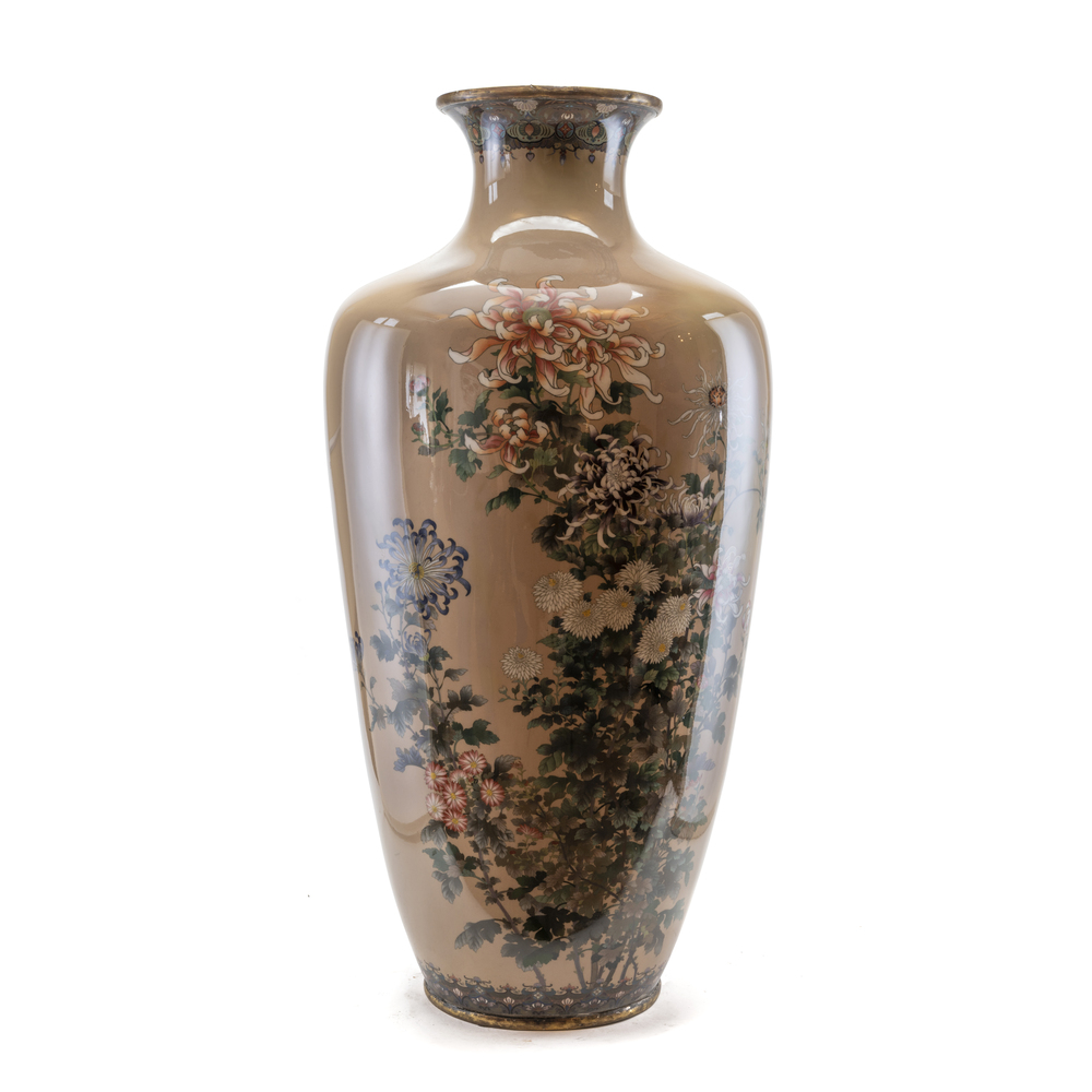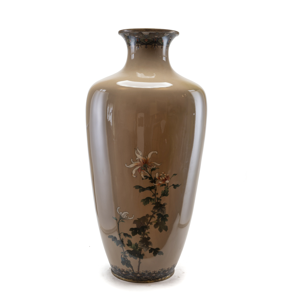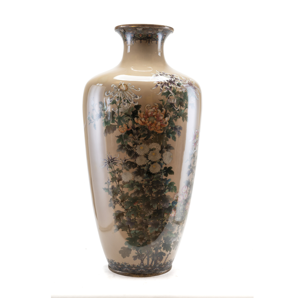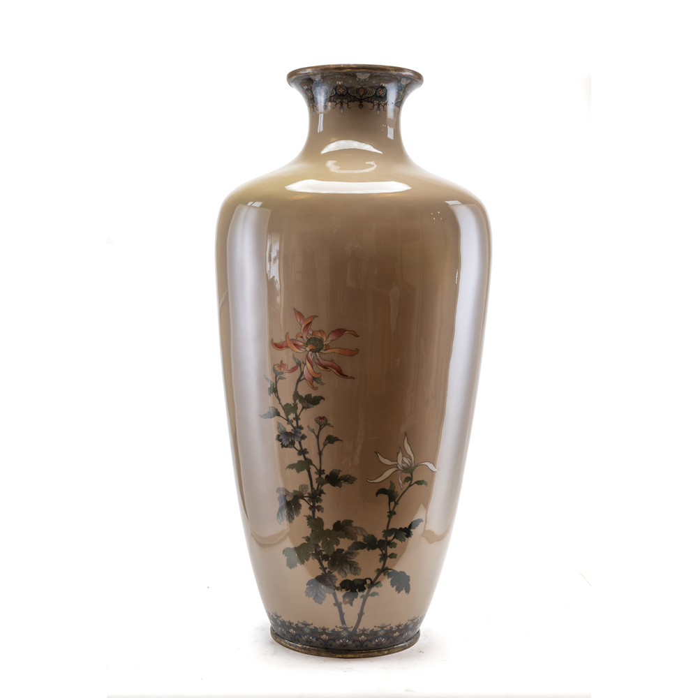 Coppia di grandi vasi a smalto cloisonnè con decori di rami in fiore su fondo color nocciola, di forma ovoidale con bocca svasata sul fondo firma su placca applicata