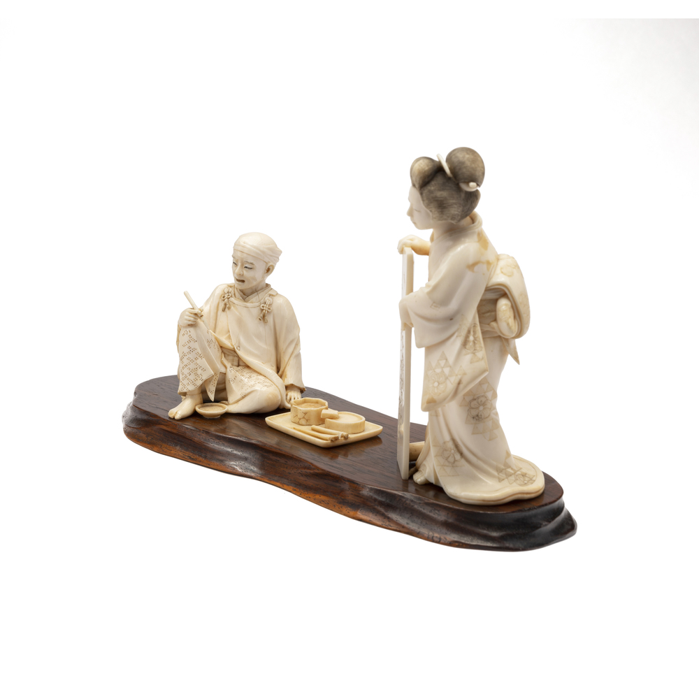 Okimono in avorio raffigurante un pittore con geisha