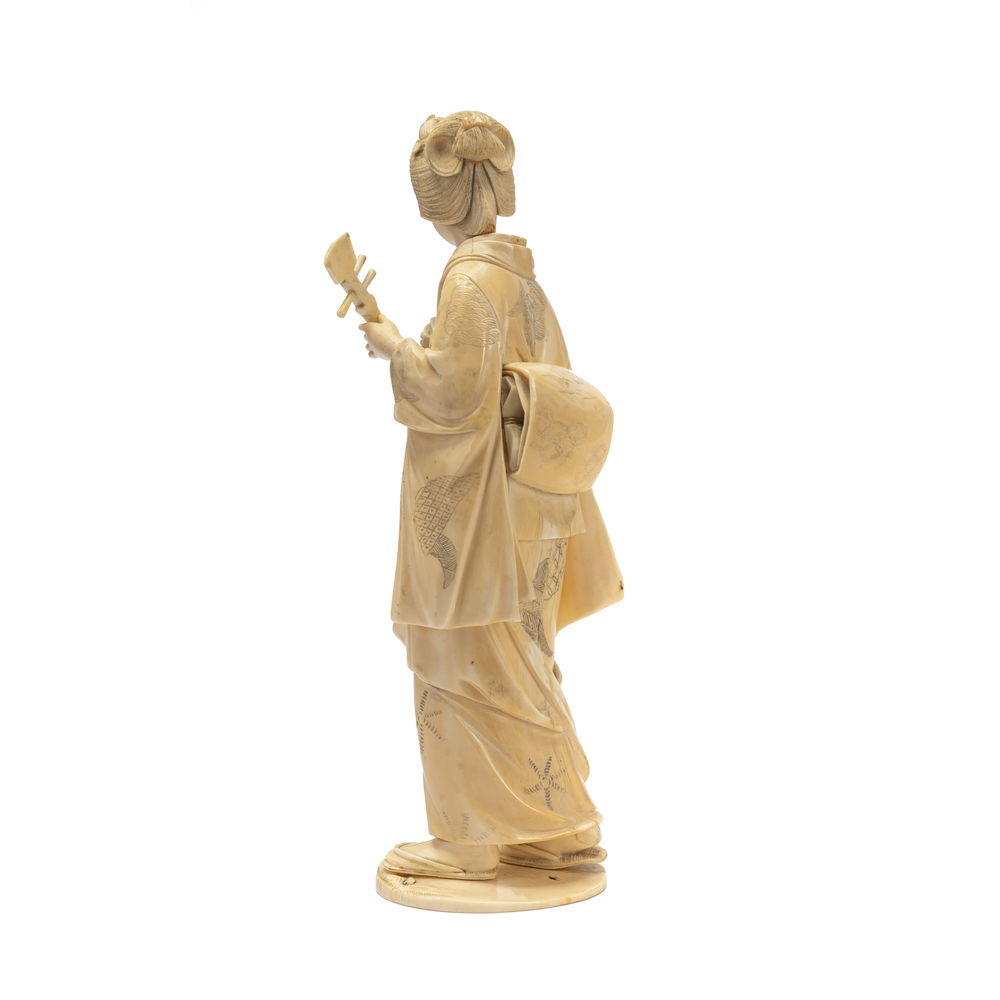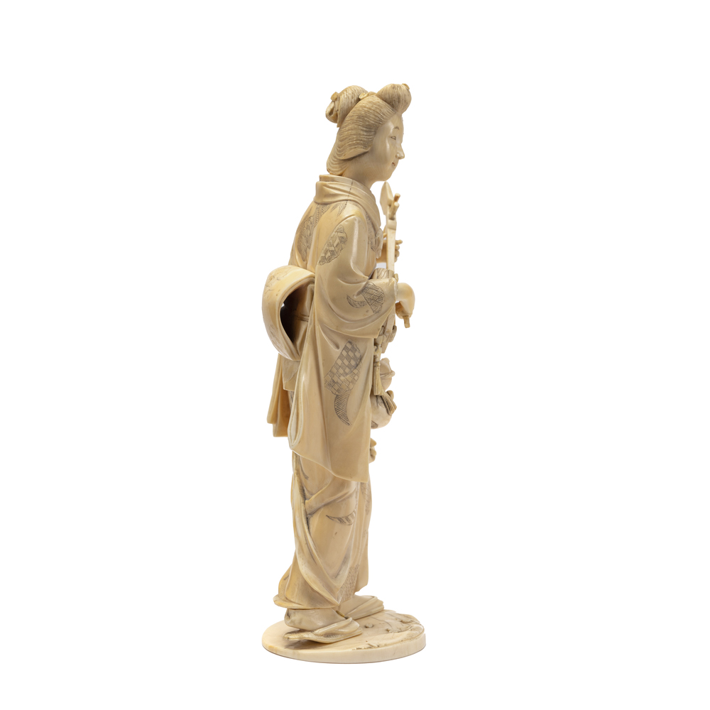 Okimono in avorio raffigurante una geisha che suona lo shamisen