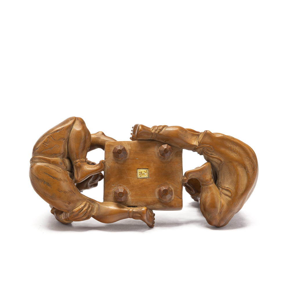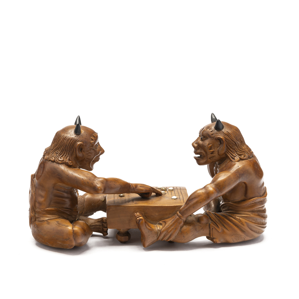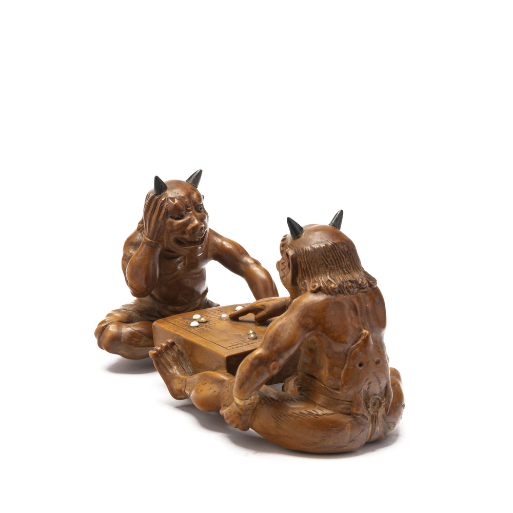 Okimono in legno di bosso raffigurante due oni seduti mentre giocano al go