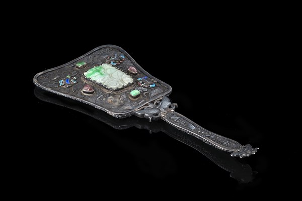 A silver mirror with jade, enamel and glass paste inserts (defects and losses)