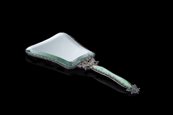 Specchio in argento con inserti in giada, smalti e paste vitree (difetti e mancanze)