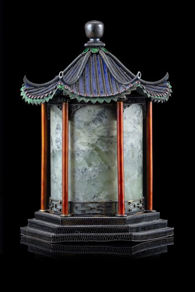 Scatola porta tea a forma di pagoda, il corpo in giada verde screziata, la struttura in argento e metallo smaltato (difetti)