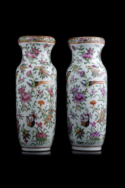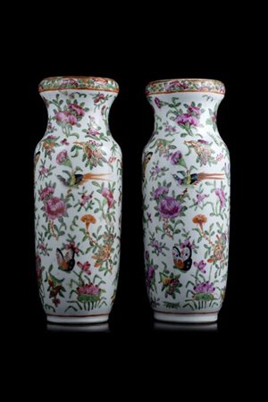 Coppia di vasi in porcellana bianca decorata nei colori della Famiglia Rosa a r