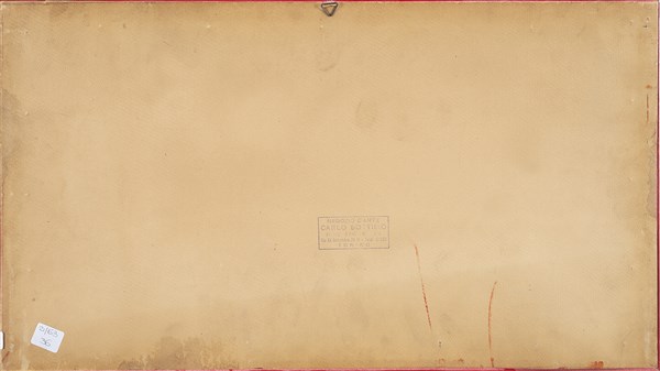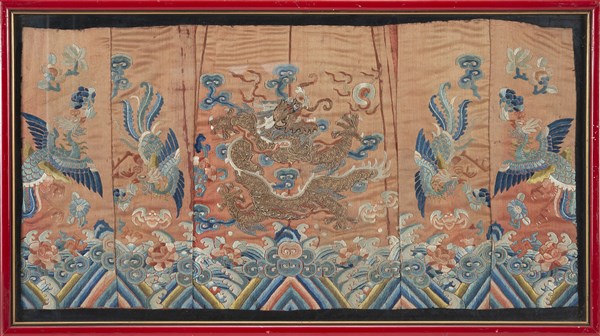 Ricamo in seta policroma su raso di seta color pesca, con applicazioni di filo in metallo dorato. Decoro con drago in movimento con le zampe a cinque dita. Parti di abito. Cina, secolo XIX (cm 50x27) (difetti)