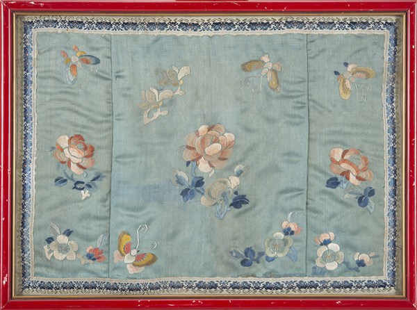 Ricamo in seta policroma su raso di seta azzurro raffigurante fiori e farfalle.