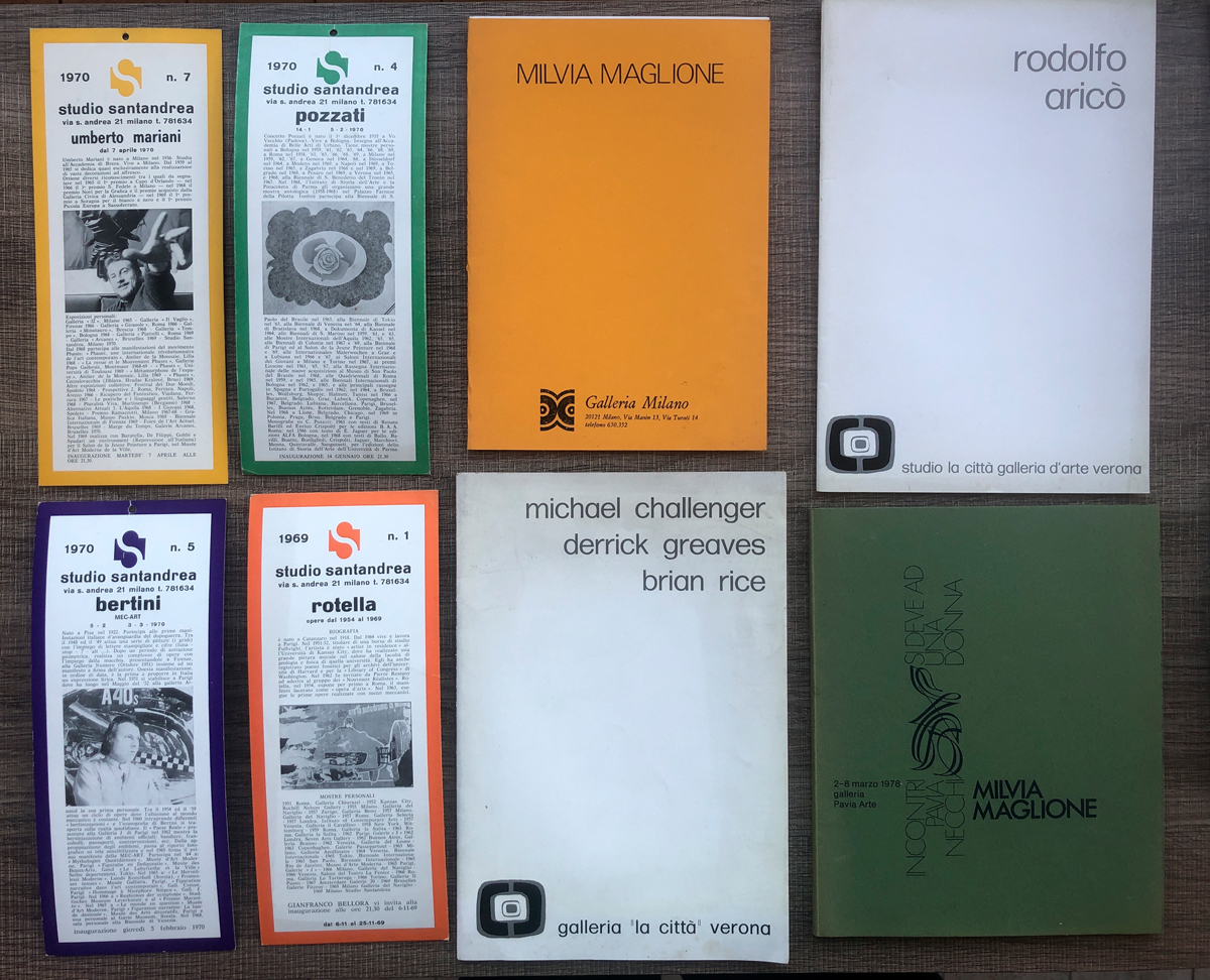 Si allegano 4 inviti illustrati editi dallo Studio Santandea, Milano, e riferiti ad esposizioni personali di Concetto Pozzati, Umberto Mariani, Mimmo Rotella e Gianni Bertini tenutesi tra il 1969 e il 1970