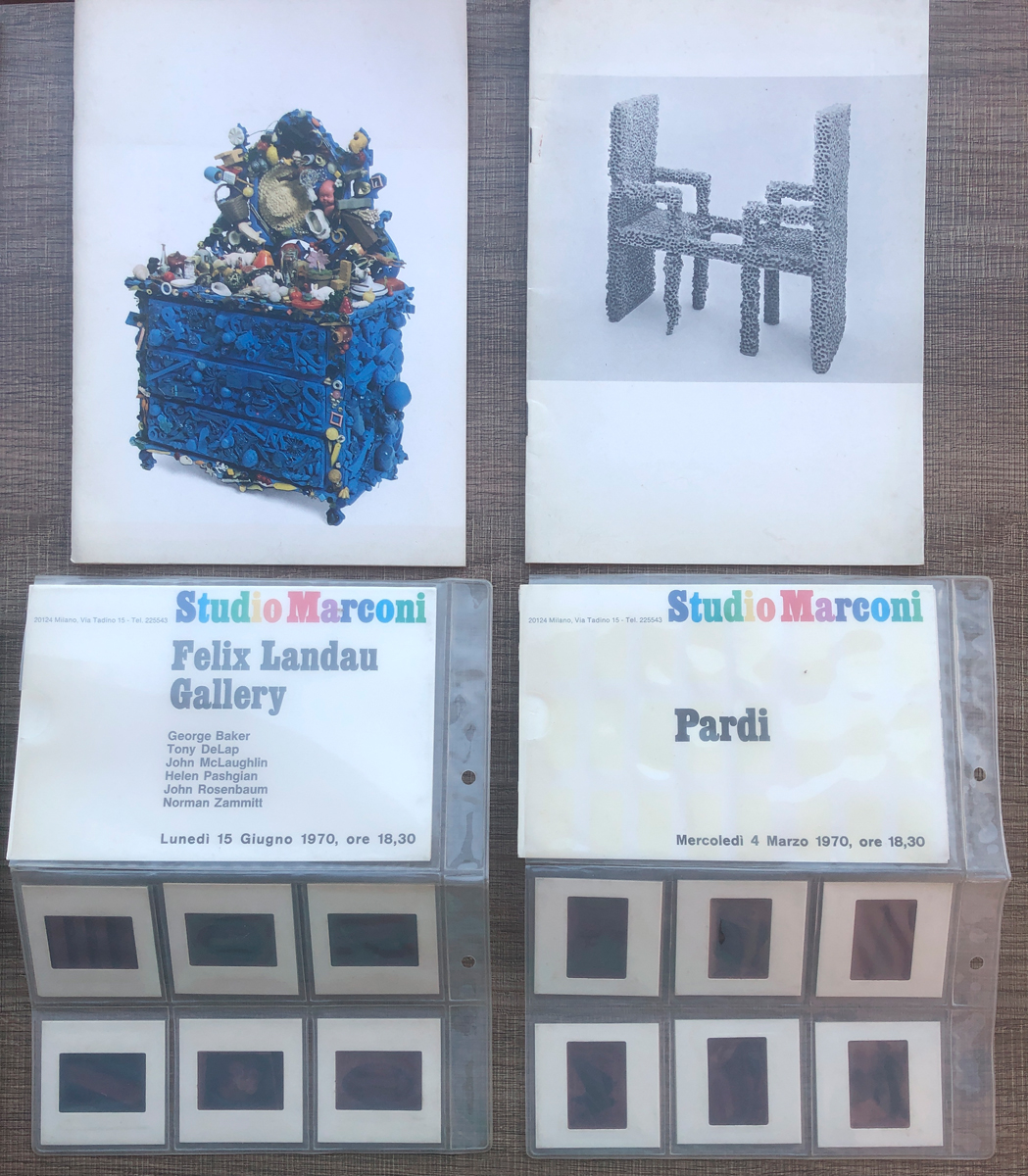Plastica trasparente contenente un invito al vernissage dell'esposizione 'Felix Landau Gallery' tenutasi presso lo Studio Marconi nel Giugno/Luglio 1970, un depliant con presentazione degli artisti e 6 fotocolor inerenti le opere esposte