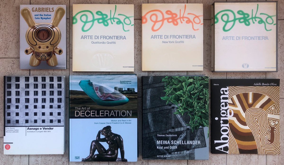 Cofanetto contenente 2 cataloghi riccamente illustrati ('Arte di frontiera. Quattordio Graffiti', a cura di Tommaso Trini, e 'Arte di frontiera. American Graffiti' da un progetto di Francesca Alinovi) editi in occasione delle esposizioni tenutesi presso Galleria d'Arte Moderna, Bologna, Sagrato del Duomo, Milano, e Palazzo delle Esposizioni, Roma, 1984