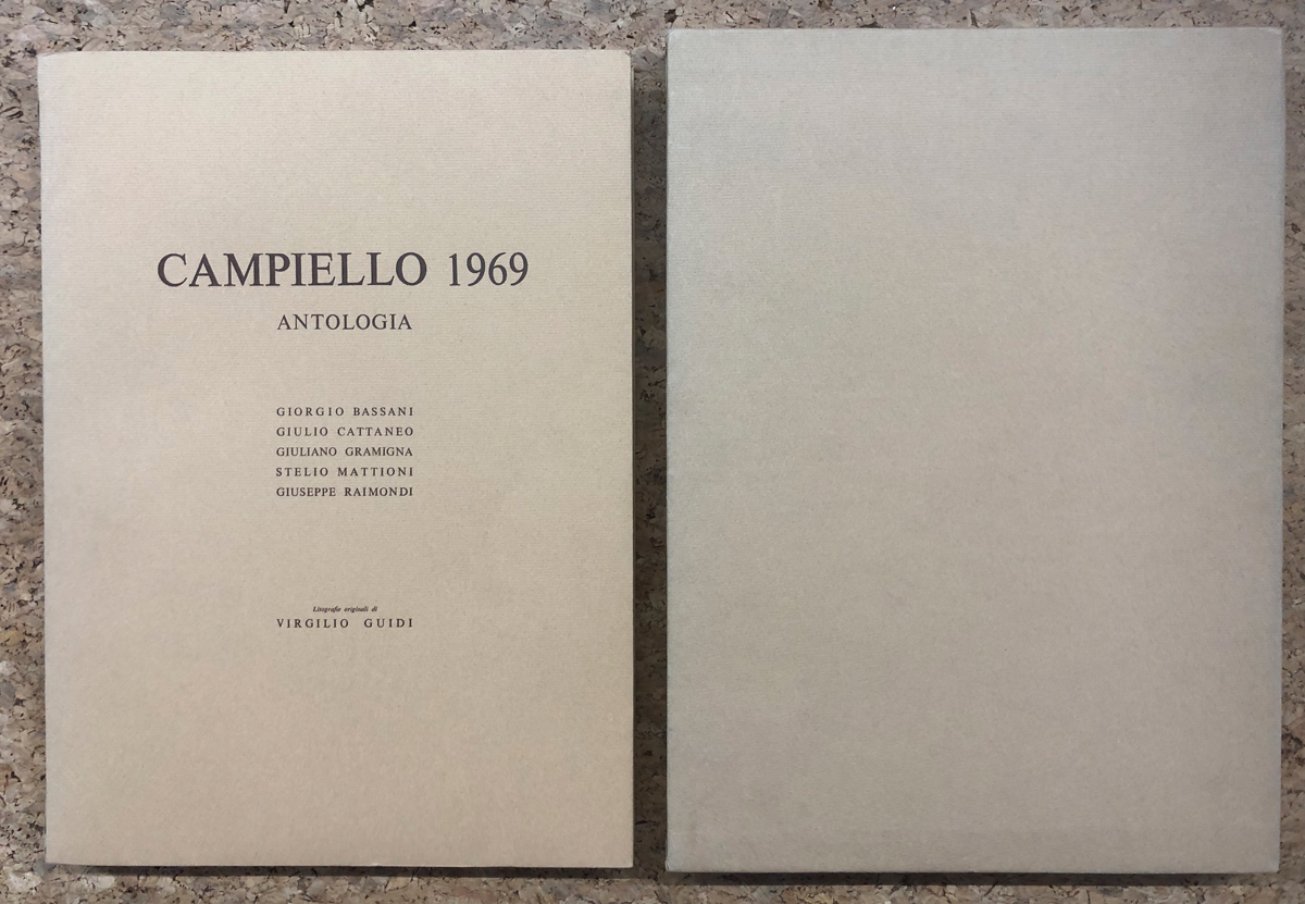 Volume contenente 5 litografie originali di Virgilio Guidi (non numerate e recanti firme in lastra) e un'antologia di testi di Giorgio Bassani, Giulio Cattaneo, Giuliano Gramigna, Stelio Mattioni e Giuseppe Raimondi
