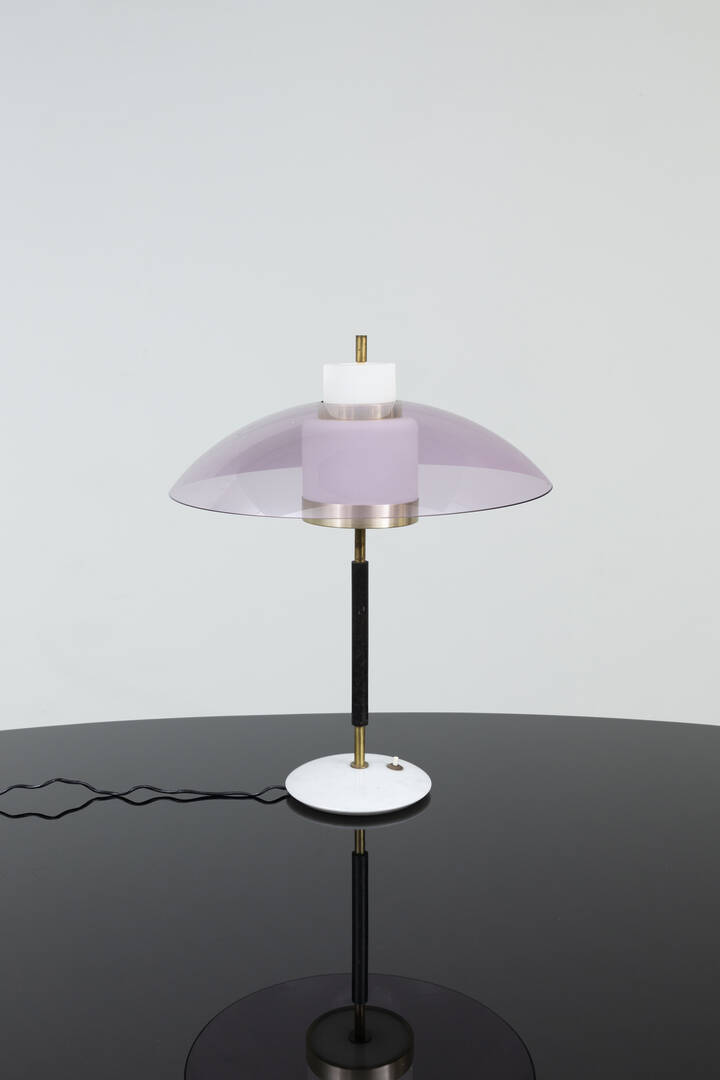 Lampada da tavolo in ottone e metallo cromato, vetro opalino e perspex, base in marmo.
