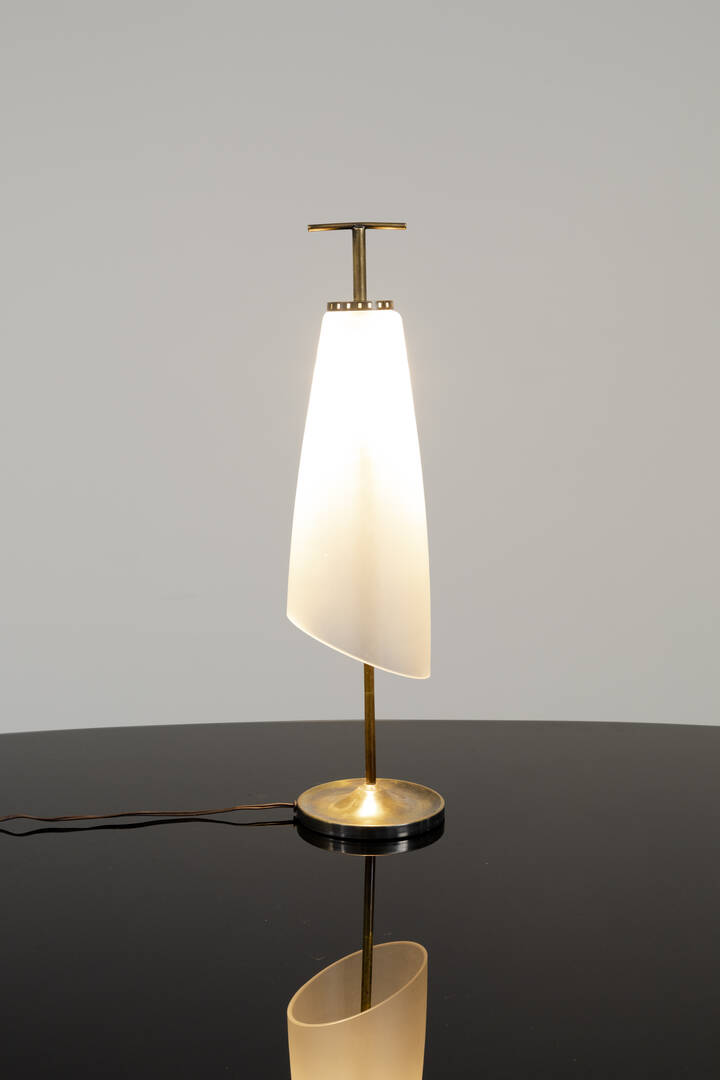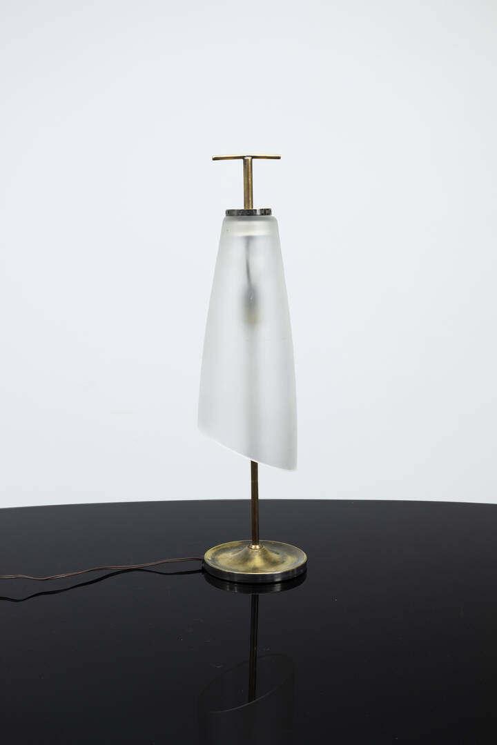 Lampada da tavolo in ottone, diffusore in vetro satinato.