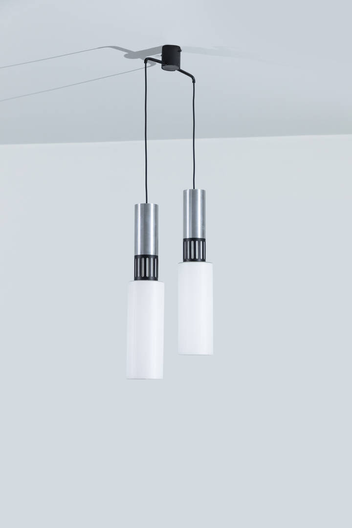 Lampadario con struttura in acciaio, metallo laccato e diffusori in vetro opalino.