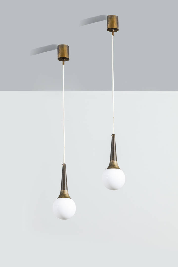Coppia di lampade a sospensione in ottone lucido e ottone brunito, diffusore in vetro opalino.