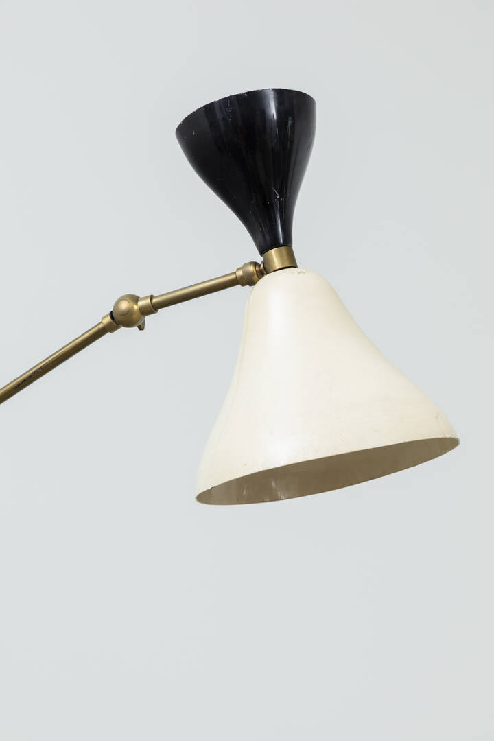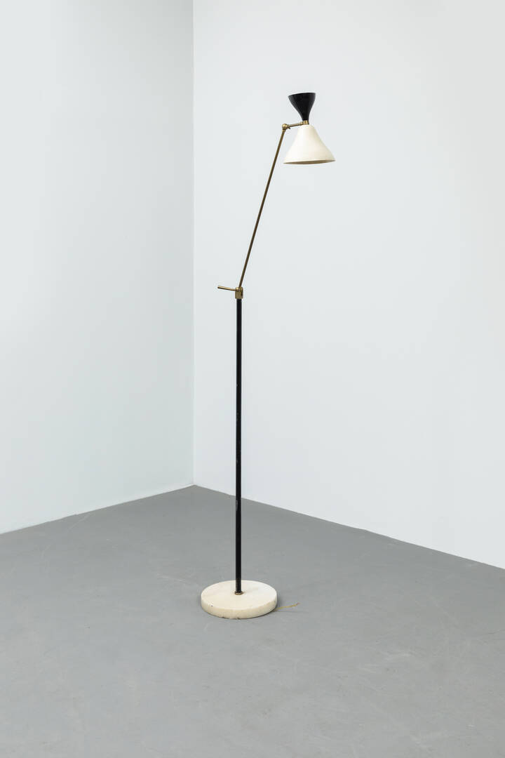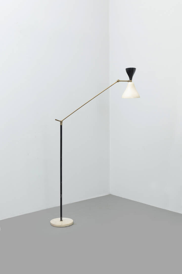Lampada da terra in ottone, doppio cono in metallo verniciato, base in marmo.