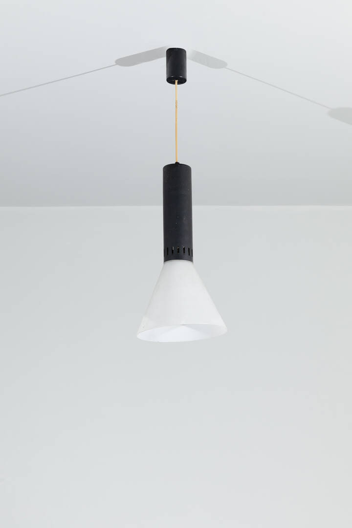 Lampadario con struttura in ottone e metallo verniciato, diffusore in vetro satinato.