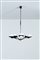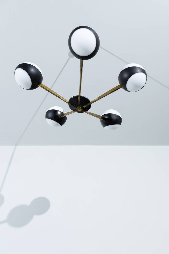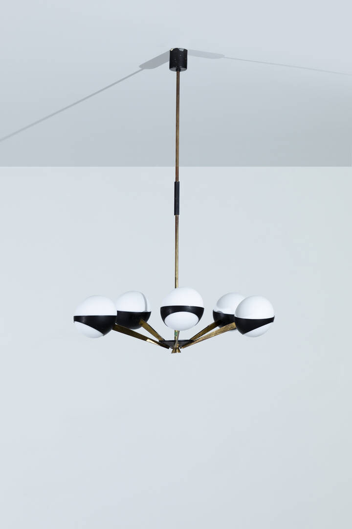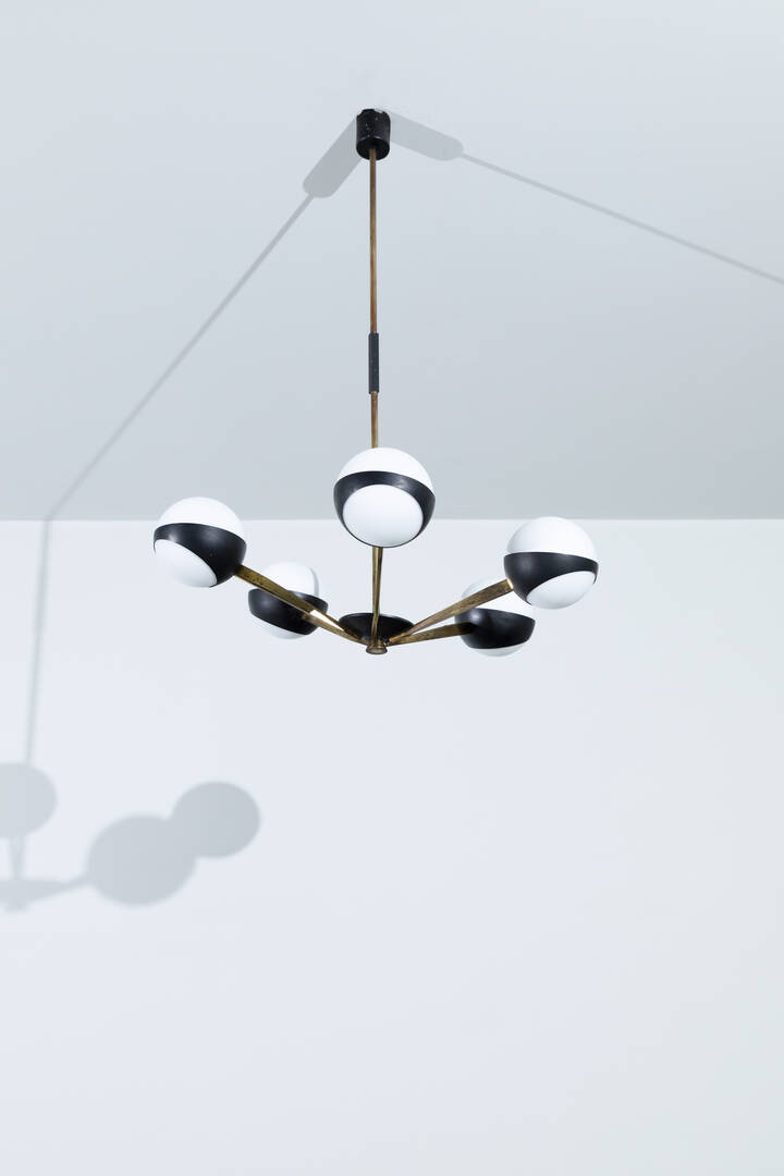 Lampadario in ottone e metallo verniciato, diffusori in vetro sabbiato.