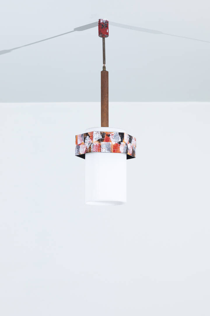 Lampada con diffusore in plexiglass, fascia in rame martellato, fusto in legno.