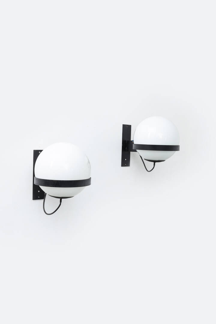 Coppia di lampade a parete in metallo verniciato, diffusori in vetro opalino.