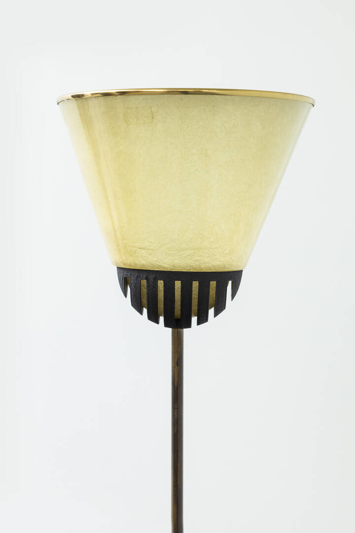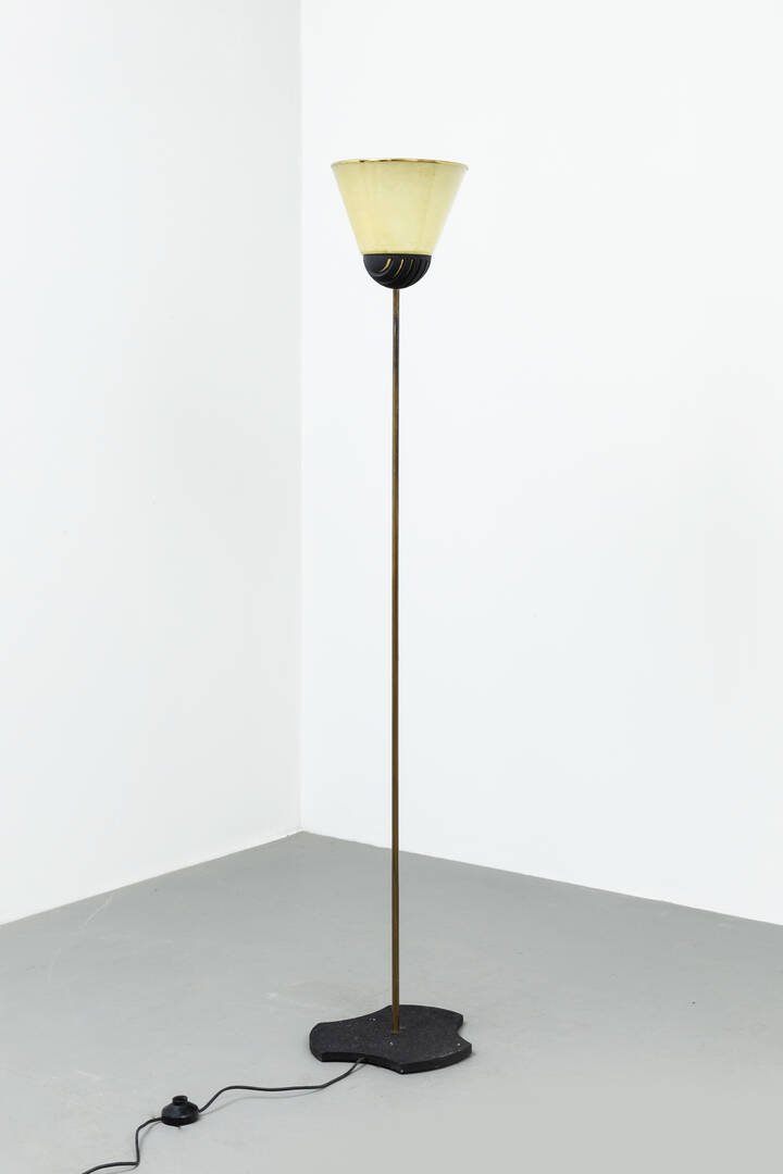 Lampada da terra con cono in vetroresina e placca in ottone, base in ghisa.