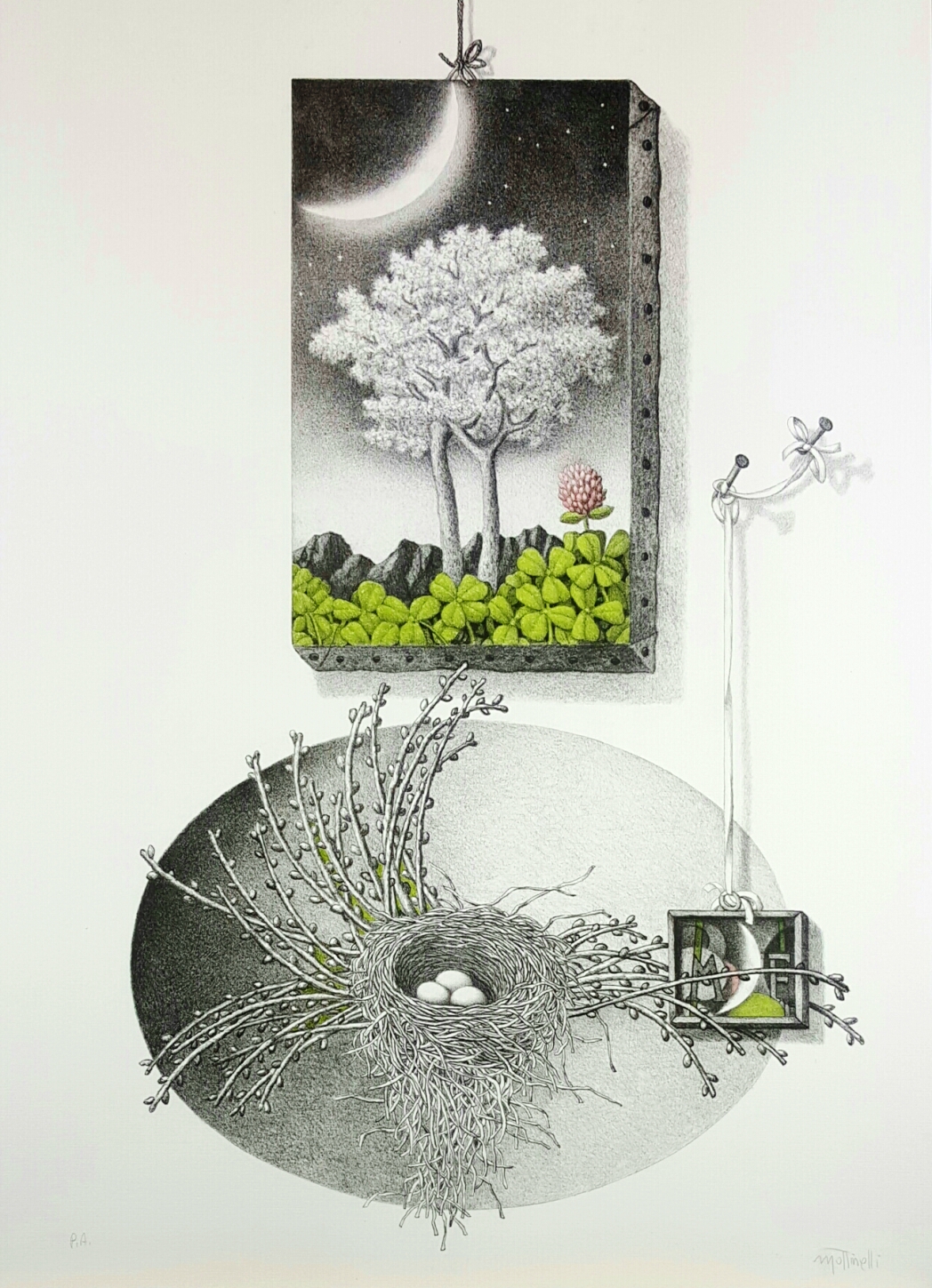 MOTTINELLI GULIO Valcamonica 1943 “Senza titolo” litografia a colori cm 50x70. Firmata sul fronte in basso a destra, tiratura P.A. in basso a sinistra.
