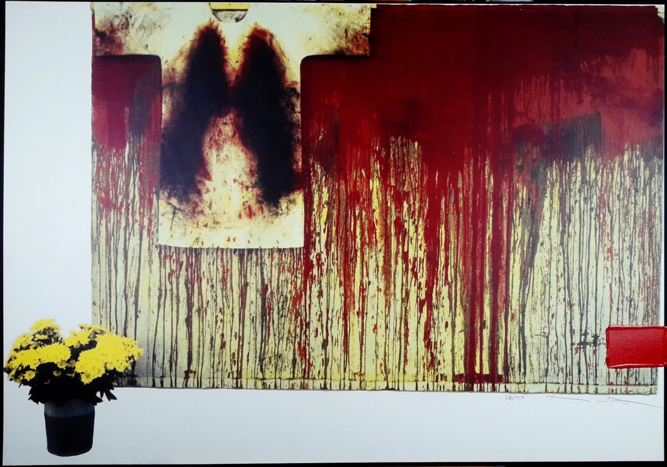 NITSCH HERMANN Vienna 1938 “Senza titolo” opere multiple ridipinte a mano, ogni foglio è un originale ridipinto a mano singolarmente e diverso dagli altri soggetti simili. La base litografica realizzata su cartoncino acquerello 300 gr. della Fedrigoni, reincartonate su cartone industriale cm 71x101 del 1991 (opere in mostra e terminate presso la sede Domus Jani Verona) .Firmata in basso a destra tiratura 28/150.
