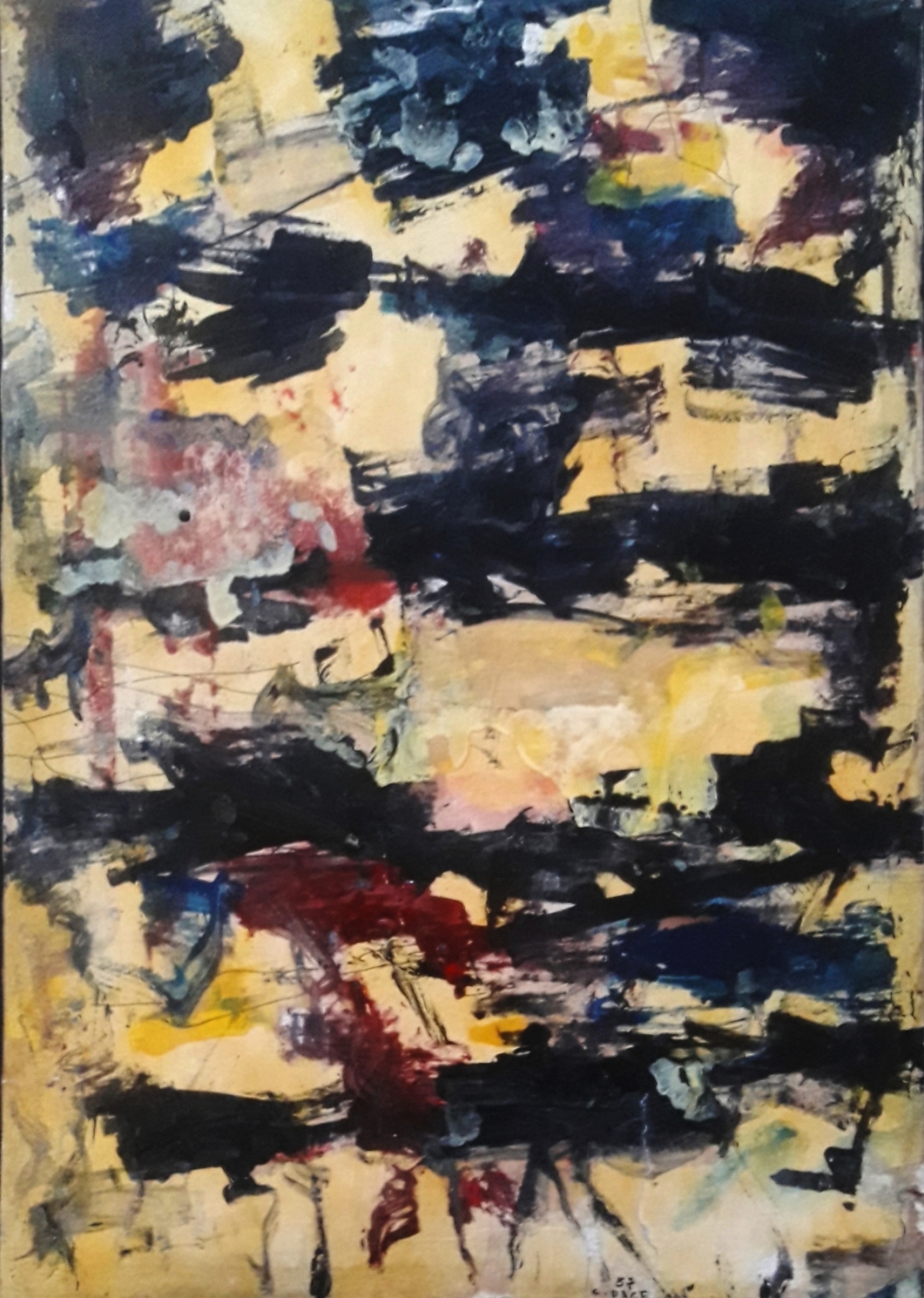PACE CARLO Campobasso 1926 “Senza titolo” smalto e cartone intelato cm 35x25 del 1957. Sul fronte in basso al centro firmato e datato. Sul retro etichetta della Galleria “Alexander” con numero d’archivio.