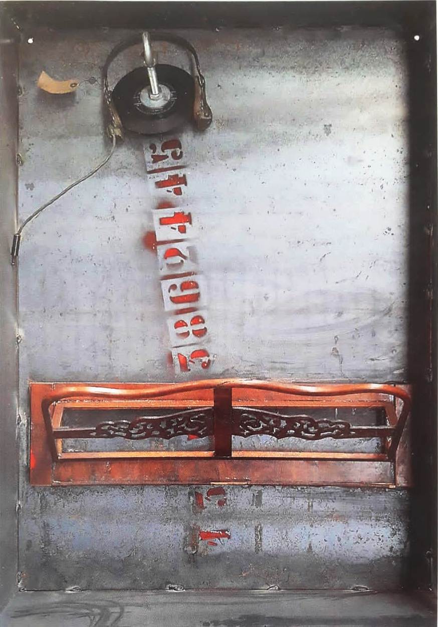 DE CHIRICO JAKOB Innsbruck 1943 “Senza titolo” acrilici e assemblaggio di oggetti di recupero in teca di acciaio cm 80x110x30 di spessore. Opera pubblicata a piena pagina del catalogo Makela”